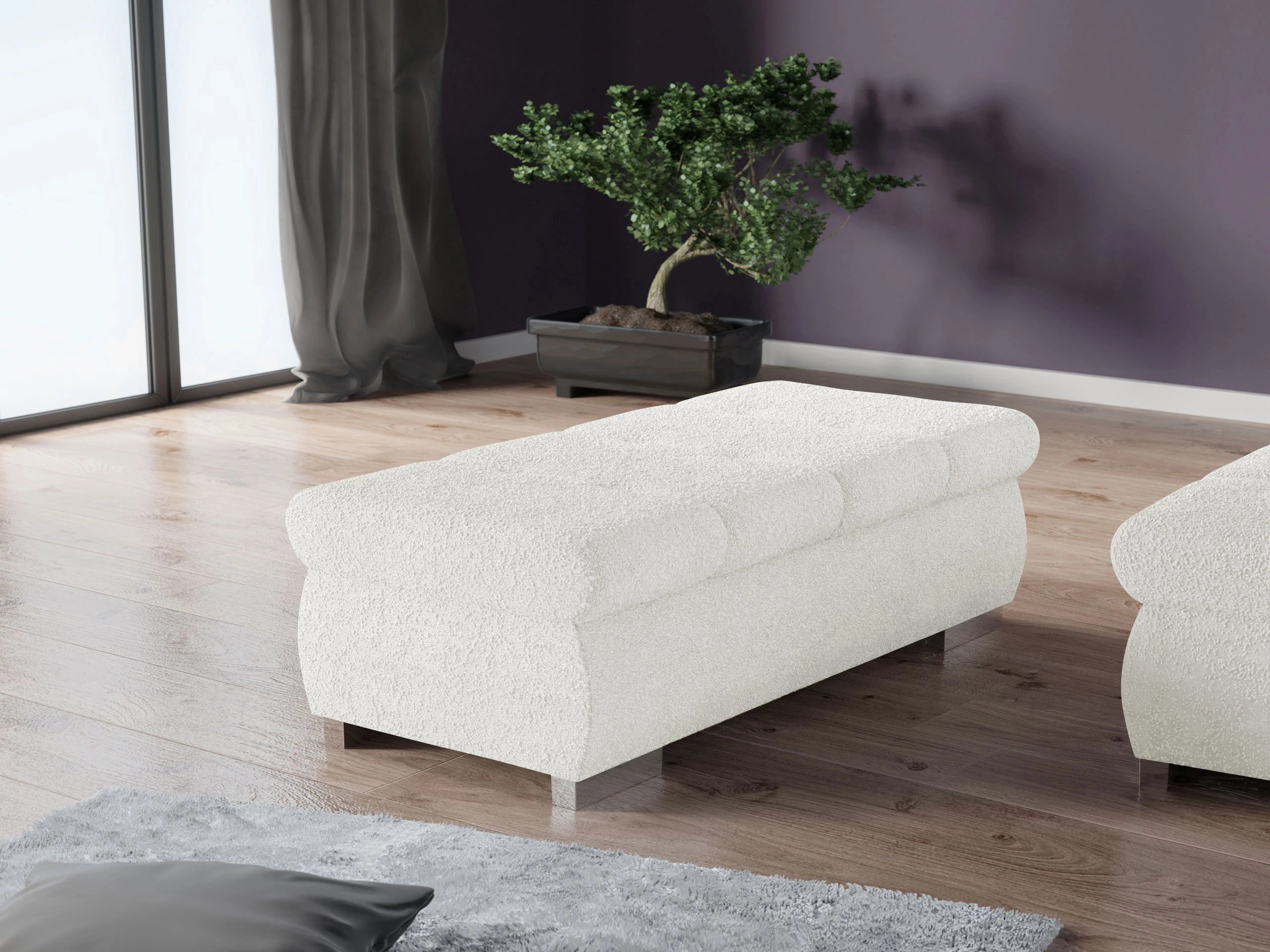 Il s'agit d'un tissu doux et délicat qui se distingue par sa structure. Les boucles et les nœuds de différentes tailles créent un motif original qui confère au meuble un caractère distinctif. Malgré sa douceur, le tissu est résistant à l'abrasion et aux rayons UV. Grâce à ces propriétés, le tissu conservera son aspect d'origine pendant de nombreuses années. Il est recommandé de nettoyer la surface du tissu avec un produit d'entretien doux. Il ne doit pas être lavé à l'eau ou blanchi.