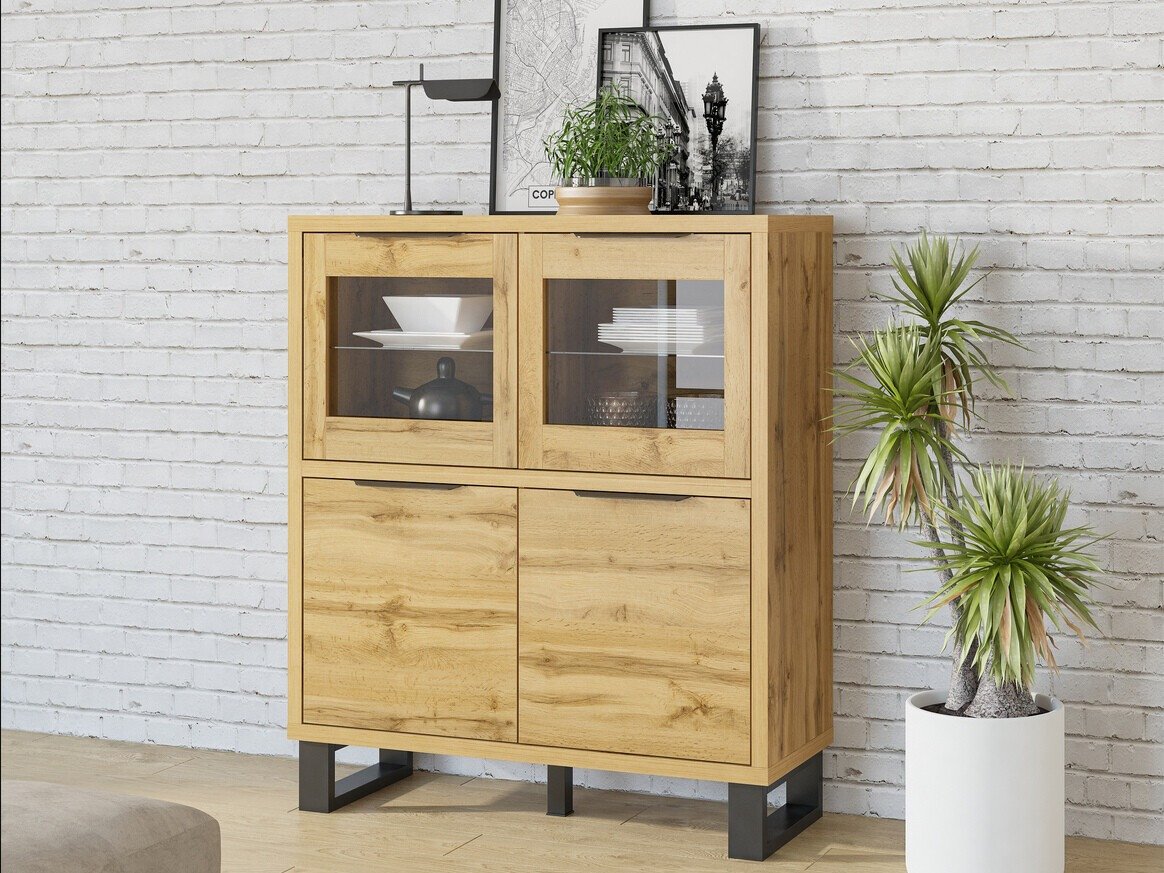 La collection de meubles de salon se mariera bien avec le béton décoratif ou la pierre naturelle. Les vitrines, les meubles TV et les commodes de cette collection ont des pieds noir qui se marient parfaitement avec les poignées en métal. Le mobilier est non seulement robuste, mais il comporte également de nombreuses étagères et tiroirs. Affichez facilement vos photos de porcelaine et de famille dans une vitrine élégante et rangez des nappes, des couvertures ou même des vêtements dans les tiroirs.