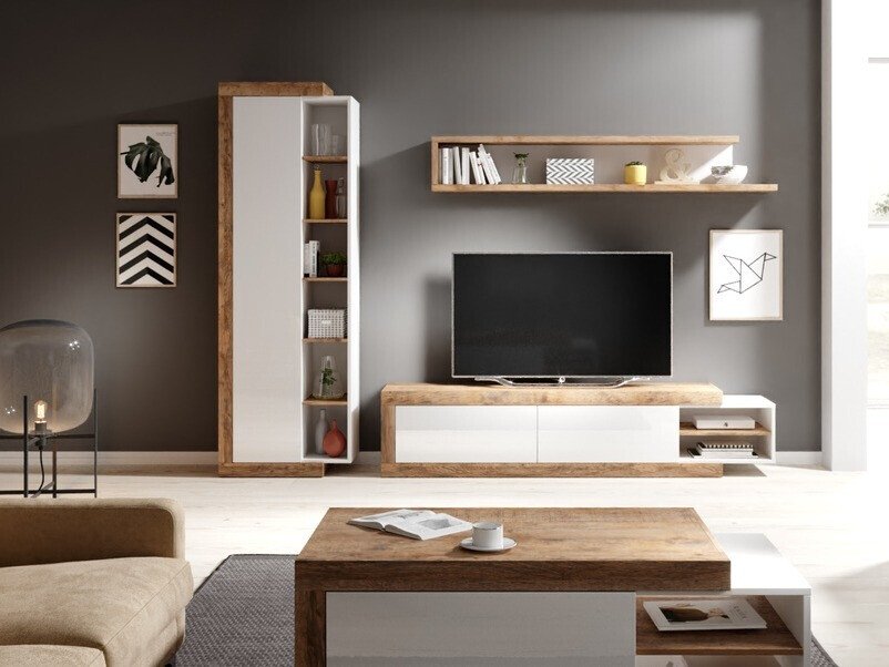 Une collection de meubles de salon au design exceptionnel qui vous captivera au premier regard. La collection est conçue pour ceux qui aiment la combinaison de l'élégance et de la modernité. La couleur blanche du meuble crée de la légèreté et s'accorde parfaitement avec la teinte chêne «Santal» qui apporte chaleur et naturel. Ce meuble se distingue par une étagère intégrée sur le côté. Le design minimaliste est renforcé par le fait que le meuble n'a pas de poignées et est équipé d'un mécanisme «Push to open». Grâce à ce mécanisme, les portes et les tiroirs peuvent être ouverts et fermés d'une simple pression. Les meubles de la collection sont fabriqués à partir de bois respectueux de l'environnement, issu de forêts, ce qui offre des avantages économiques.