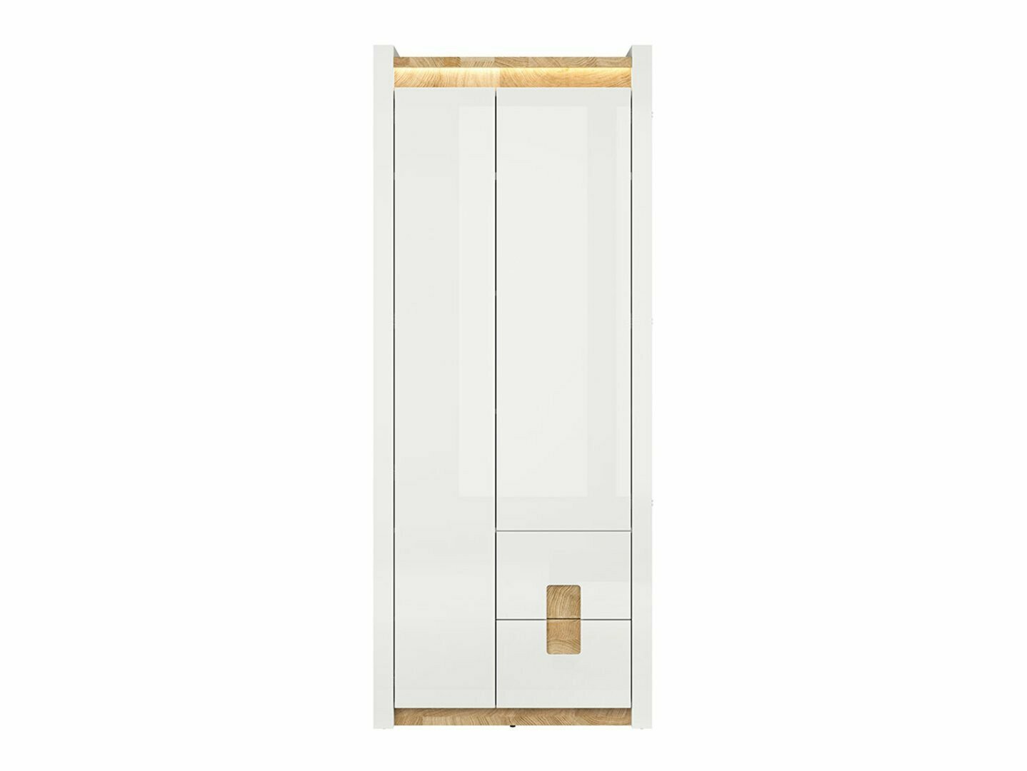 Cette collection de meubles est unique en ce qu'elle offre une large sélection de modèles de meubles pour divers espaces de la maison. Créez un intérieur solide à la fois dans le salon et dans la chambre. Et si les meubles s'intègrent également dans le couloir ? Ou au bureau ? Tout est possible avec cette collection. La palette de couleurs claires aura fière allure dans les petits et les grands espaces. Les façades des meubles sont dominées par une couleur blanche brillante, parfaitement complétée par des détails de couleur bois. La couleur et les motifs du bois sont magnifiquement révélés dans les tables de meubles, donnant une sensation de confort. La solution de poignée attire également l'attention, qui s'intègre non seulement comme poignées, mais aussi comme détail de décoration. Il y aura certainement assez d'espace pour ranger les choses, le meuble a beaucoup de tiroirs et d'étagères. Un charme supplémentaire est fourni par l'éclairage LED intégré à économie d'énergie. Cette solution vous permettra de profiter d'une lumière cosy qui mettra en valeur les inserts couleur bois. Le mécanisme de fermeture silencieux empêchera les portes et les tiroirs de se fermer rapidement.