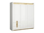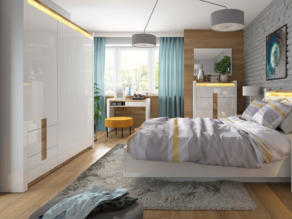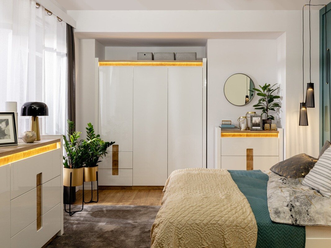 Cette collection de meubles est unique en ce qu'elle offre une large sélection de modèles de meubles pour divers espaces de la maison. Créez un intérieur solide à la fois dans le salon et dans la chambre. Et si les meubles s'intègrent également dans le couloir ? Ou au bureau ? Tout est possible avec cette collection. La palette de couleurs claires aura fière allure dans les petits et les grands espaces. Les façades des meubles sont dominées par une couleur blanche brillante, parfaitement complétée par des détails de couleur bois. La couleur et les motifs du bois sont magnifiquement révélés dans les tables de meubles, donnant une sensation de confort. La solution de poignée attire également l'attention, qui s'intègre non seulement comme poignées, mais aussi comme détail de décoration. Il y aura certainement assez d'espace pour ranger les choses, le meuble a beaucoup de tiroirs et d'étagères. Un charme supplémentaire est fourni par l'éclairage LED intégré à économie d'énergie. Cette solution vous permettra de profiter d'une lumière cosy qui mettra en valeur les inserts couleur bois. Le mécanisme de fermeture silencieux empêchera les portes et les tiroirs de se fermer rapidement.