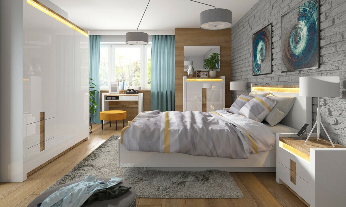 Cette collection de meubles est unique en ce qu'elle offre une large sélection de modèles de meubles pour divers espaces de la maison. Créez un intérieur solide à la fois dans le salon et dans la chambre. Et si les meubles s'intègrent également dans le couloir ? Ou au bureau ? Tout est possible avec cette collection. La palette de couleurs claires aura fière allure dans les petits et les grands espaces. Les façades des meubles sont dominées par une couleur blanche brillante, parfaitement complétée par des détails de couleur bois. La couleur et les motifs du bois sont magnifiquement révélés dans les tables de meubles, donnant une sensation de confort. La solution de poignée attire également l'attention, qui s'intègre non seulement comme poignées, mais aussi comme détail de décoration. Il y aura certainement assez d'espace pour ranger les choses, le meuble a beaucoup de tiroirs et d'étagères. Un charme supplémentaire est fourni par l'éclairage LED intégré à économie d'énergie. Cette solution vous permettra de profiter d'une lumière cosy qui mettra en valeur les inserts couleur bois. Le mécanisme de fermeture silencieux empêchera les portes et les tiroirs de se fermer rapidement.