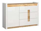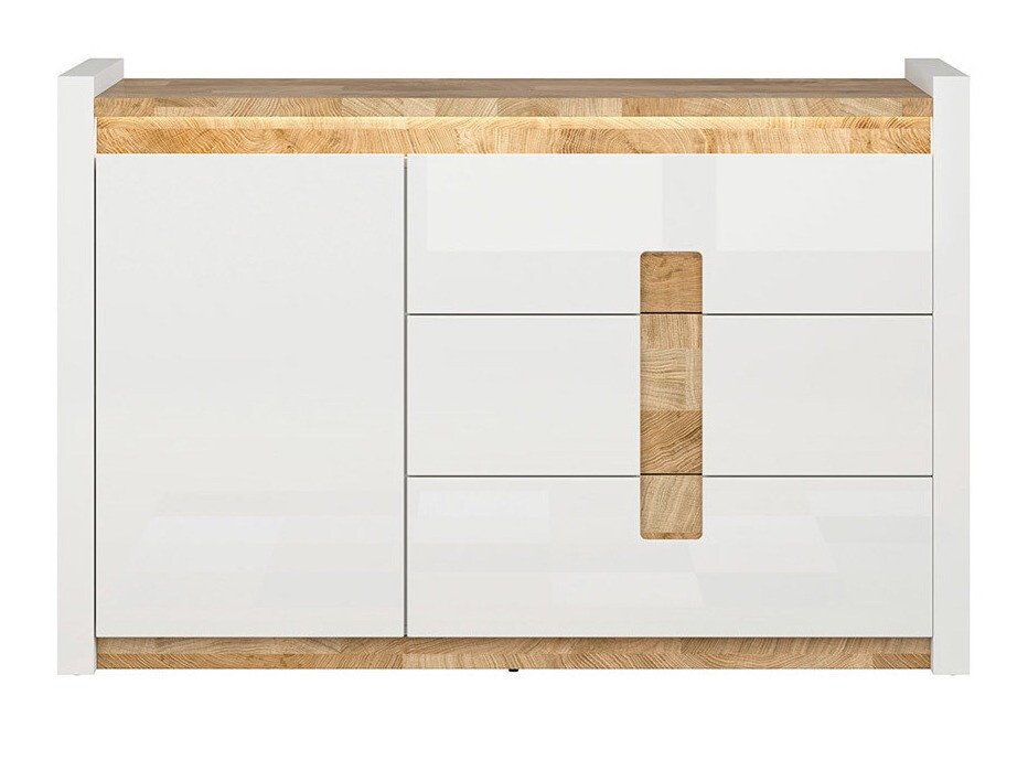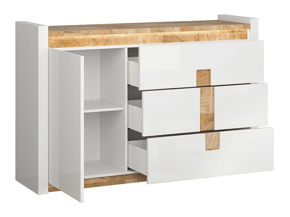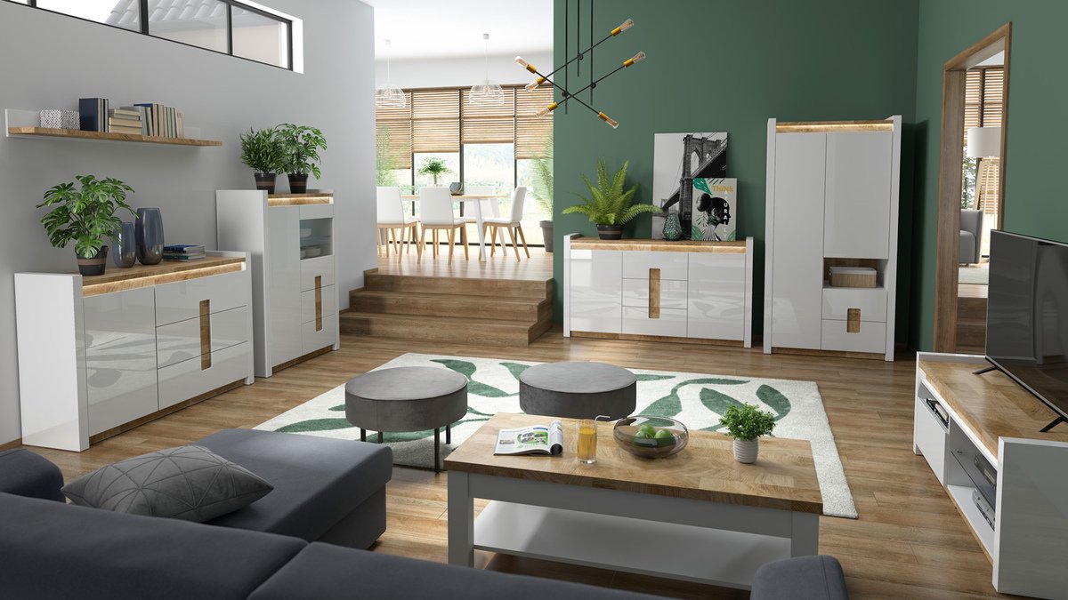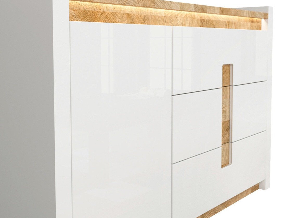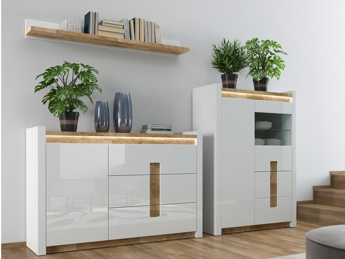 Cette collection de meubles est unique en ce qu'elle offre une large sélection de modèles de meubles pour divers espaces de la maison. Créez un intérieur solide à la fois dans le salon et dans la chambre. Et si les meubles s'intègrent également dans le couloir ? Ou au bureau ? Tout est possible avec cette collection. La palette de couleurs claires aura fière allure dans les petits et les grands espaces. Les façades des meubles sont dominées par une couleur blanche brillante, parfaitement complétée par des détails de couleur bois. La couleur et les motifs du bois sont magnifiquement révélés dans les tables de meubles, donnant une sensation de confort. La solution de poignée attire également l'attention, qui s'intègre non seulement comme poignées, mais aussi comme détail de décoration. Il y aura certainement assez d'espace pour ranger les choses, le meuble a beaucoup de tiroirs et d'étagères. Un charme supplémentaire est fourni par l'éclairage LED intégré à économie d'énergie. Cette solution vous permettra de profiter d'une lumière cosy qui mettra en valeur les inserts couleur bois. Le mécanisme de fermeture silencieux empêchera les portes et les tiroirs de se fermer rapidement.
