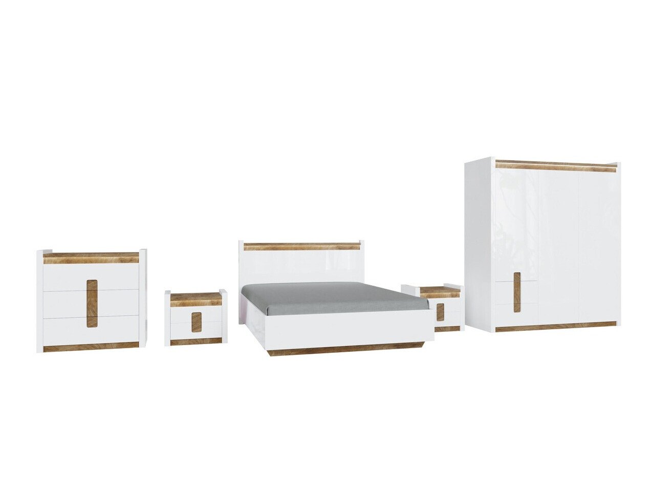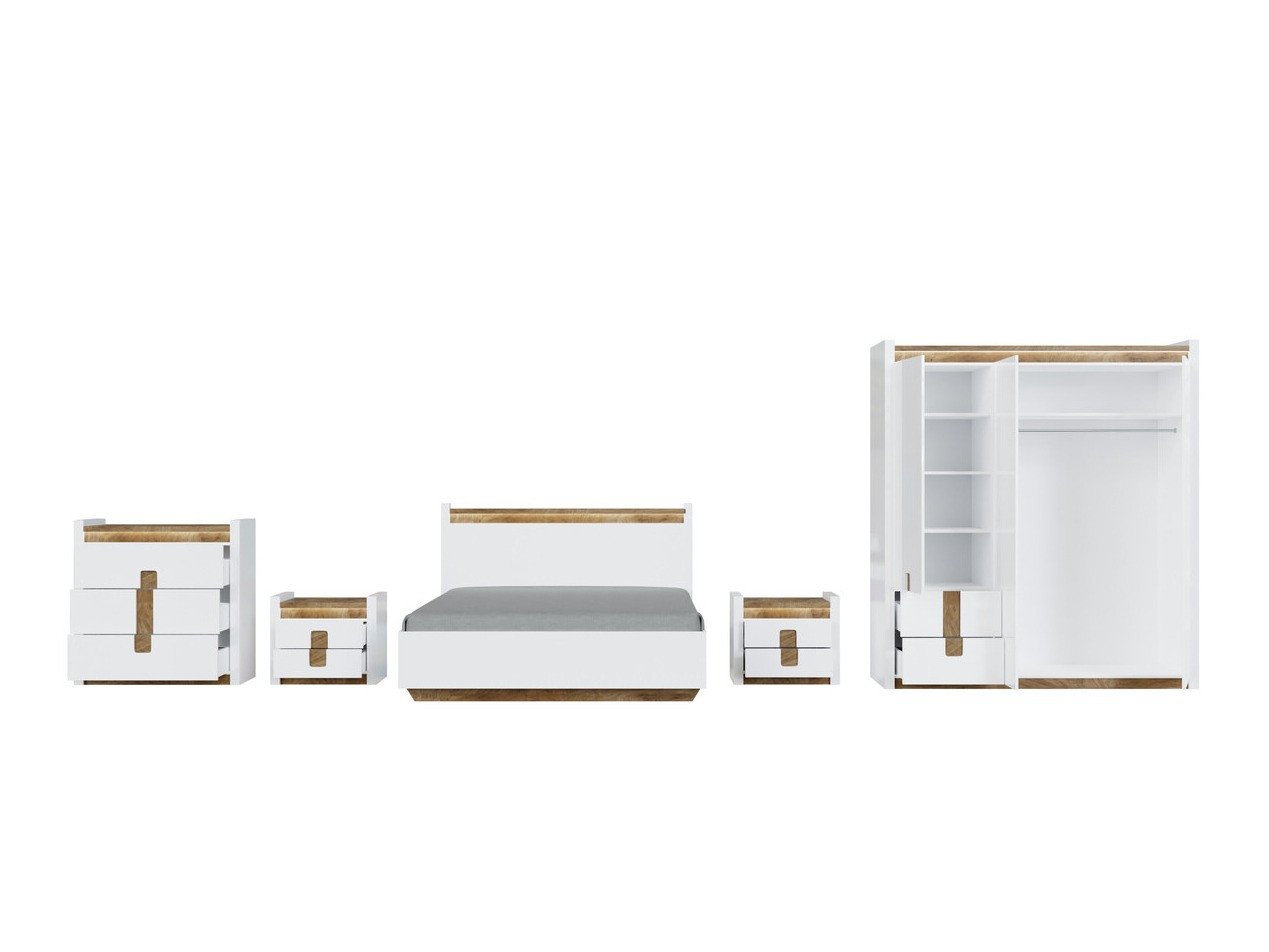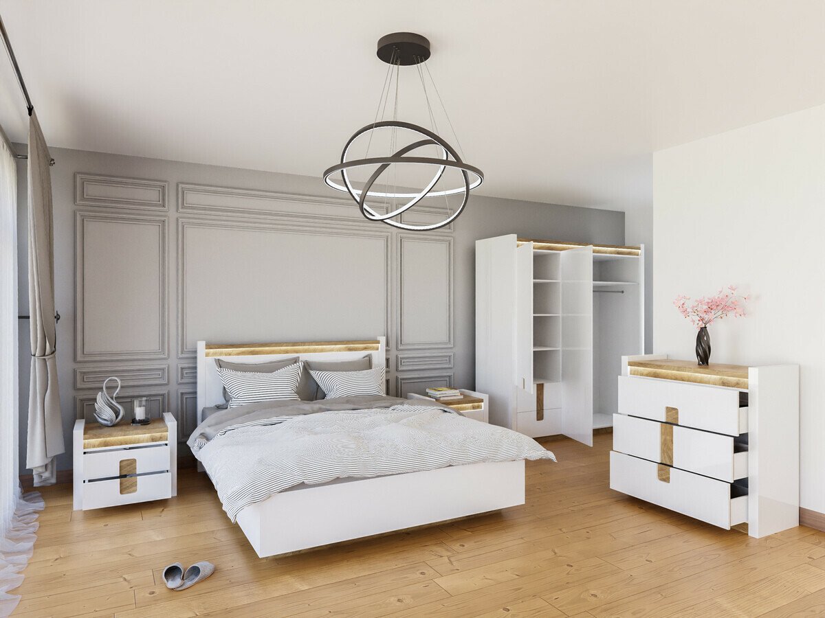 Cette collection de meubles est unique en ce qu'elle offre une large sélection de modèles de meubles pour divers espaces de la maison. Créez un intérieur solide à la fois dans le salon et dans la chambre. Et si les meubles s'intègrent également dans le couloir ? Ou au bureau ? Tout est possible avec cette collection. La palette de couleurs claires aura fière allure dans les petits et les grands espaces. Les façades des meubles sont dominées par une couleur blanche brillante, parfaitement complétée par des détails de couleur bois. La couleur et les motifs du bois sont magnifiquement révélés dans les tables de meubles, donnant une sensation de confort. La solution de poignée attire également l'attention, qui s'intègre non seulement comme poignées, mais aussi comme détail de décoration. Il y aura certainement assez d'espace pour ranger les choses, le meuble a beaucoup de tiroirs et d'étagères. Un charme supplémentaire est fourni par l'éclairage LED intégré à économie d'énergie. Cette solution vous permettra de profiter d'une lumière cosy qui mettra en valeur les inserts couleur bois. Le mécanisme de fermeture silencieux empêchera les portes et les tiroirs de se fermer rapidement.