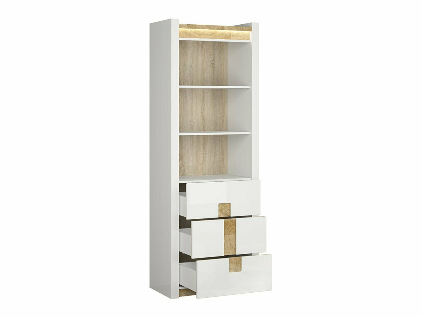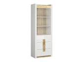 Cette collection de meubles est unique en ce qu'elle offre une large sélection de modèles de meubles pour divers espaces de la maison. Créez un intérieur solide à la fois dans le salon et dans la chambre. Et si les meubles s'intègrent également dans le couloir ? Ou au bureau ? Tout est possible avec cette collection. La palette de couleurs claires aura fière allure dans les petits et les grands espaces. Les façades des meubles sont dominées par une couleur blanche brillante, parfaitement complétée par des détails de couleur bois. La couleur et les motifs du bois sont magnifiquement révélés dans les tables de meubles, donnant une sensation de confort. La solution de poignée attire également l'attention, qui s'intègre non seulement comme poignées, mais aussi comme détail de décoration. Il y aura certainement assez d'espace pour ranger les choses, le meuble a beaucoup de tiroirs et d'étagères. Un charme supplémentaire est fourni par l'éclairage LED intégré à économie d'énergie. Cette solution vous permettra de profiter d'une lumière cosy qui mettra en valeur les inserts couleur bois. Le mécanisme de fermeture silencieux empêchera les portes et les tiroirs de se fermer rapidement.
