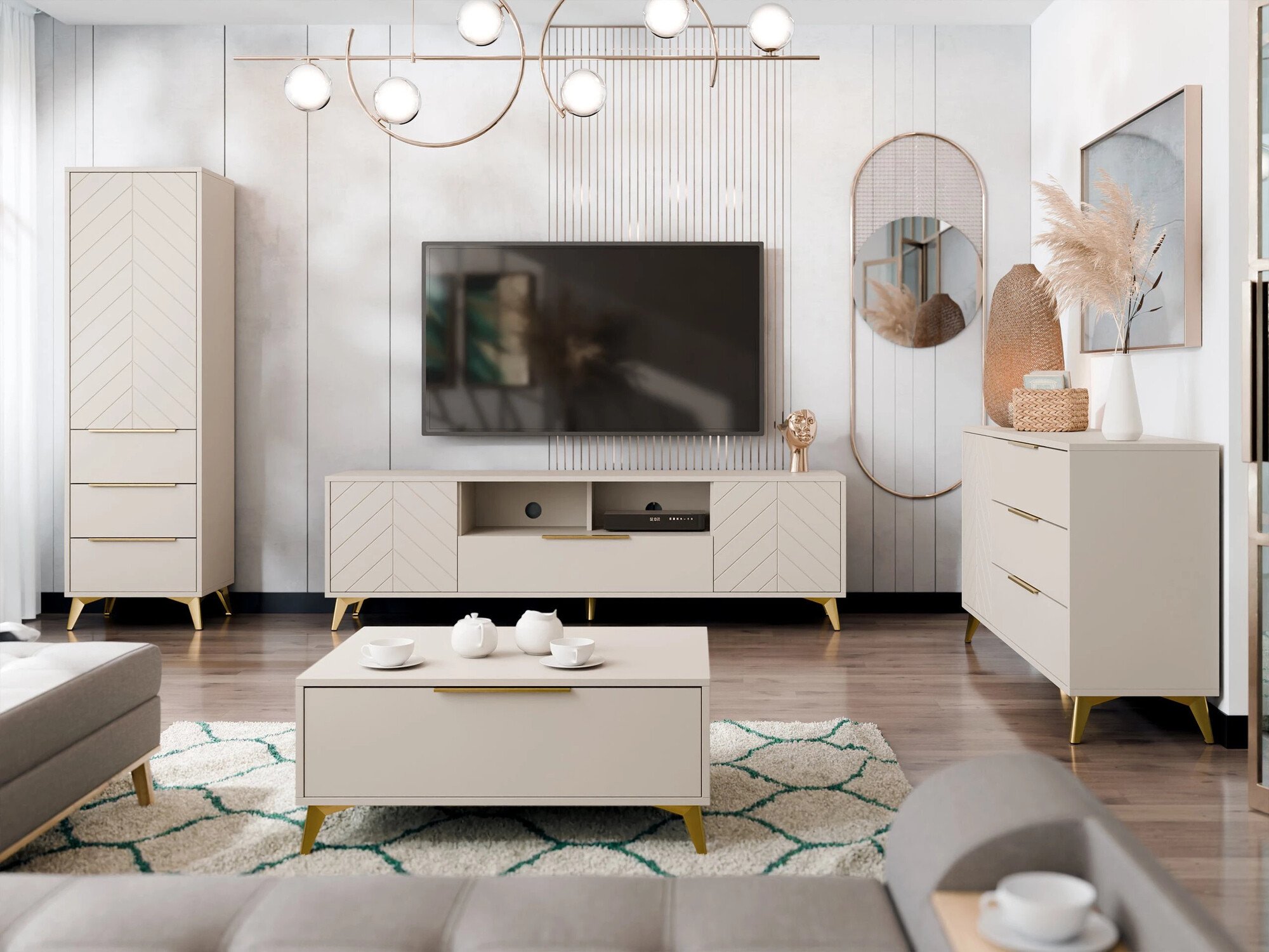 Cette collection de meubles classiques modernes allie élégance subtile et fonctionnalité contemporaine. Elle offre des solutions pour les maisons où le design et l'atmosphère sont aussi importants l'un que l'autre pour créer un intérieur distinctif. Le caractère de la collection est défini par des détails soigneusement étudiés. Le mécanisme à touche unique est associé à des poignées en métal doré, créant un équilibre entre la simplicité minimaliste et l'expression décorative. Cette combinaison réfléchie souligne subtilement l'essence du style classique moderne. Les pieds en métal apportent une légèreté visuelle et une touche d'élégance supplémentaire, tandis que leur hauteur est optimisée pour les maisons équipées d'aspirateurs robots, ce qui facilite l'entretien quotidien.