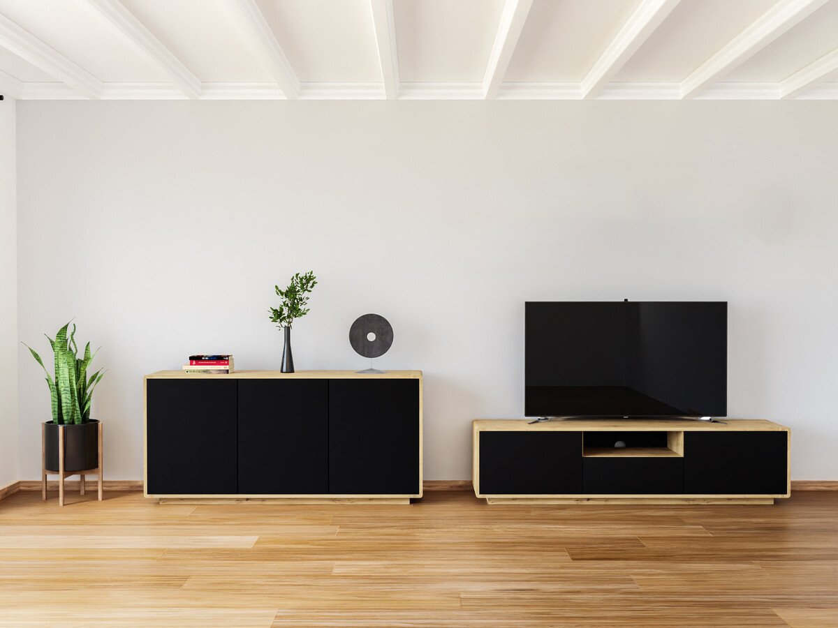 La surface du meuble est recouverte d'un film spécial qui crée un effet extrêmement mat. La principale caractéristique de ce film est sa résistance aux marques de contact. Grâce à cette caractéristique, aucune trace de doigt n'est visible sur la surface du meuble, ce qui facilite l'entretien de la surface. La surface mate du meuble semble lisse et souligne parfaitement le design exclusif du meuble.