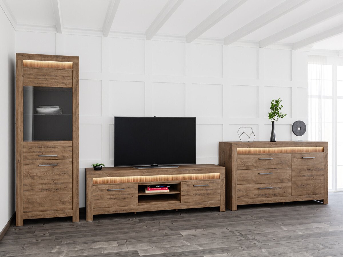 Si vous souhaitez que votre salon soit cosy, découvrez les meubles de cette collection. Après avoir décoré votre intérieur avec cette collection, vous pourrez profiter du mobilier de la couleur chêne «Reveal», associé à des poignées en métal, cette combinaison crée un design harmonieux. Créez un salon encore plus élégant en choisissant des meubles avec éclairage LED intégré ou en option, qui lui donneront une touche unique. La collection utilise du verre trempé, qui est plus sûr et a une meilleure résistance mécanique que le verre ordinaire. De plus, ces meubles disposent d'un mécanisme de fermeture silencieux, grâce auquel les tiroirs et les portes sont protégés des fermetures brusques.