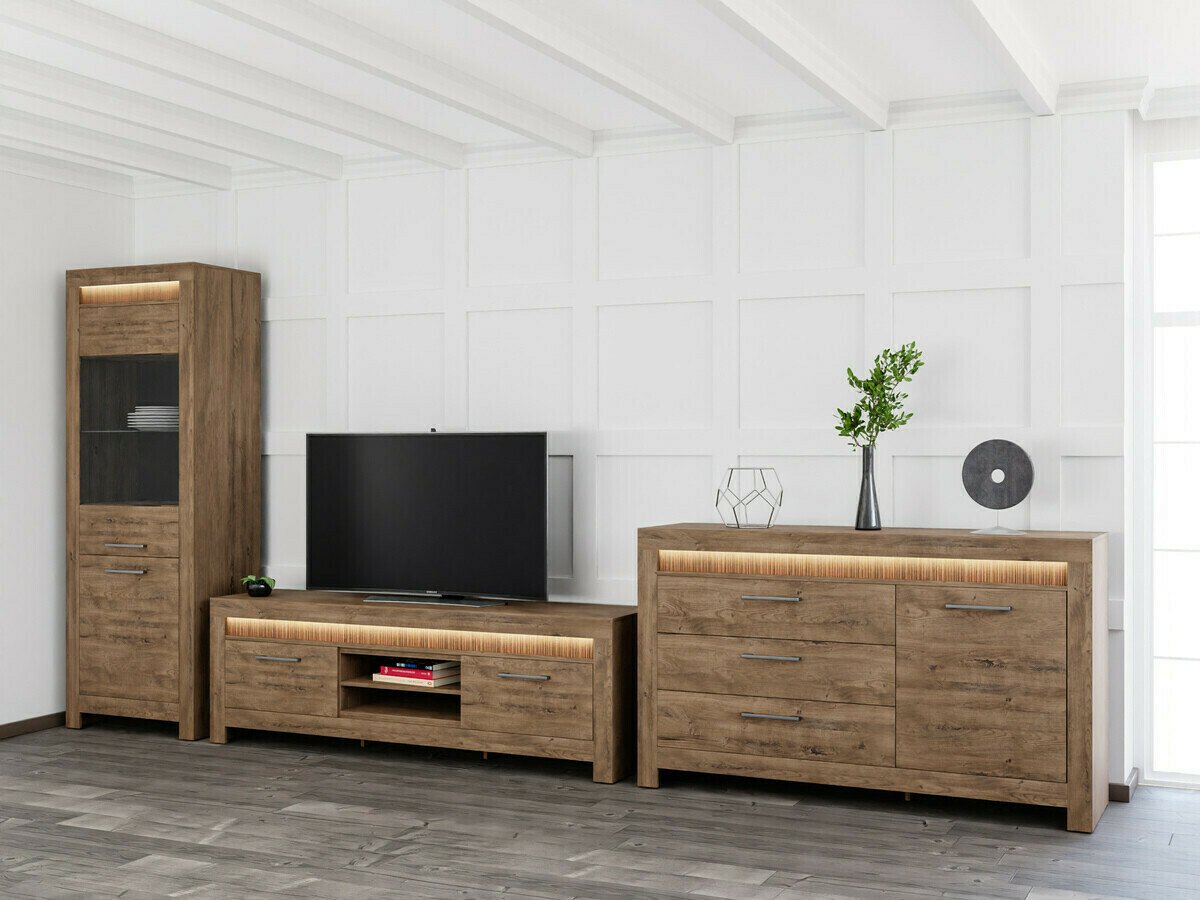 Si vous souhaitez que votre salon soit cosy, découvrez les meubles de cette collection. Après avoir décoré votre intérieur avec cette collection, vous pourrez profiter du mobilier de la couleur chêne «Reveal», associé à des poignées en métal, cette combinaison crée un design harmonieux. Créez un salon encore plus élégant en choisissant des meubles avec éclairage LED intégré ou en option, qui lui donneront une touche unique. La collection utilise du verre trempé, qui est plus sûr et a une meilleure résistance mécanique que le verre ordinaire. De plus, ces meubles disposent d'un mécanisme de fermeture silencieux, grâce auquel les tiroirs et les portes sont protégés des fermetures brusques.