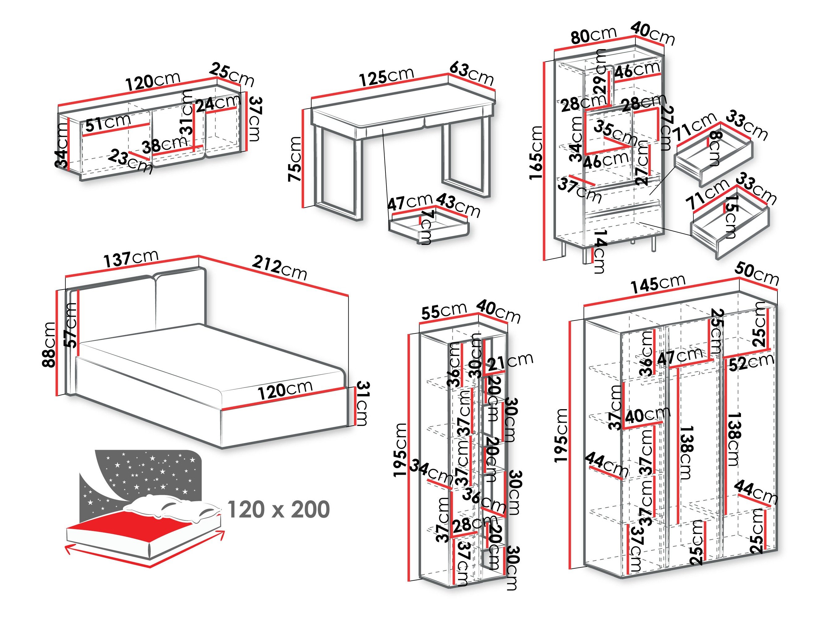 165 x 80 x 40; 195 x 55 x 40 cm