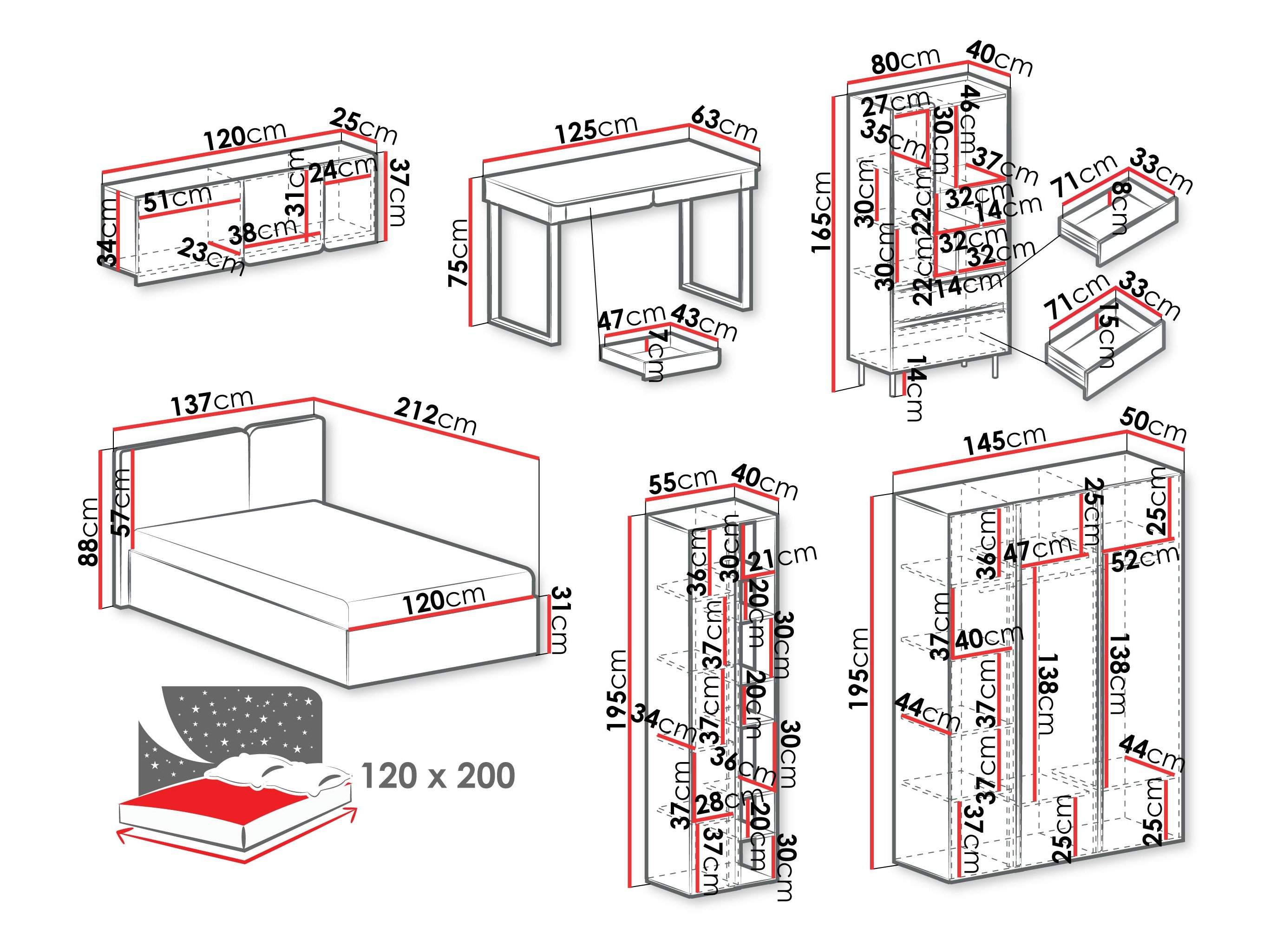 165 x 80 x 40; 195 x 55 x 40 cm