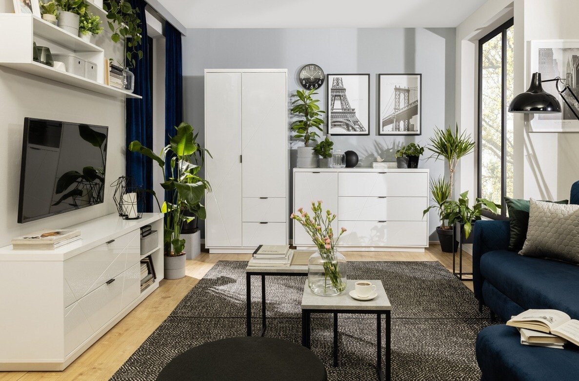 La collection impressionne par son design moderne, complété par les formes d’inspiration minimaliste. Ceci est un example de style d’intérieur moderne. Les motifs décoratifs sur les façades donnent au mobilier un charme supplémentaire. Les meubles de cette collection s’intégreront parfaitement dans l’espace de séjour. Il y aura certainement assez de place pour tout, car les meubles ne manquent pas d’étagères et de grands tiroirs. Lors de la création d’un design, la fonctionnalité est également rappelée. Les tiroirs et les portes ont un mécanisme de fermeture silencieux qui protège la porte et les tiroirs d'une fermeture rapide, sans causer de bruit supplémentaire. Les vitrines utilisent du verre trempé, qui se caractérise par sa résistance et sa durabilité. De plus, il est possible d'intégrer un éclairage LED dans les vitrines, ce qui mettra en valeur les détails de l'intérieur des vitrines. Choisissez votre couleur préférée et commencez à apporter des modifications à l'intérieur de la maison.