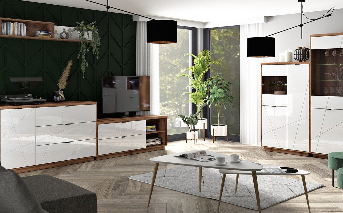 La collection impressionne par son design moderne, complété par les formes d’inspiration minimaliste. Ceci est un example de style d’intérieur moderne. Les motifs décoratifs sur les façades donnent au mobilier un charme supplémentaire. Les meubles de cette collection s’intégreront parfaitement dans l’espace de séjour. Il y aura certainement assez de place pour tout, car les meubles ne manquent pas d’étagères et de grands tiroirs. Lors de la création d’un design, la fonctionnalité est également rappelée. Les tiroirs et les portes ont un mécanisme de fermeture silencieux qui protège la porte et les tiroirs d'une fermeture rapide, sans causer de bruit supplémentaire. Les vitrines utilisent du verre trempé, qui se caractérise par sa résistance et sa durabilité. De plus, il est possible d'intégrer un éclairage LED dans les vitrines, ce qui mettra en valeur les détails de l'intérieur des vitrines. Choisissez votre couleur préférée et commencez à apporter des modifications à l'intérieur de la maison.