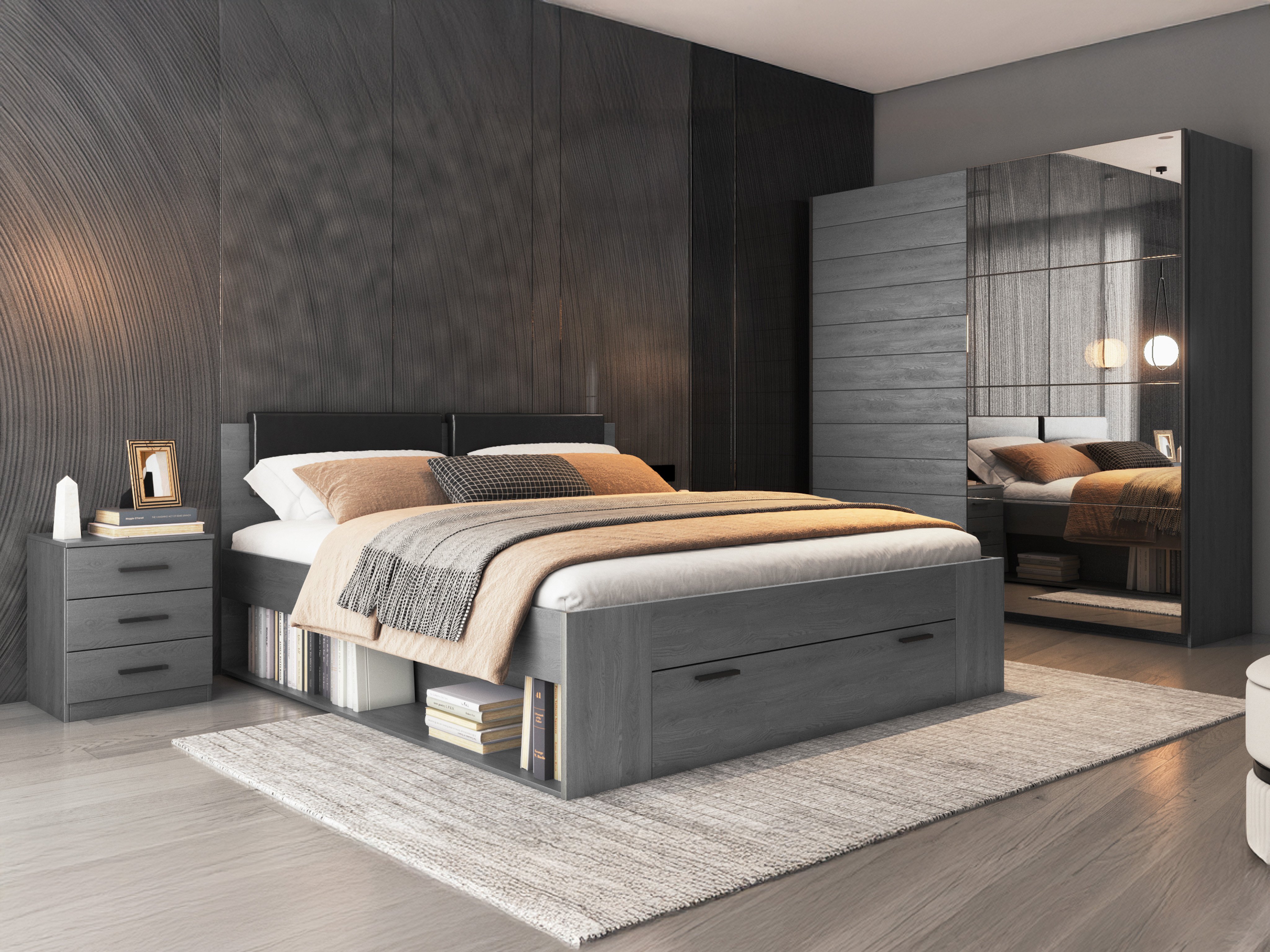 Le lit de cette collection est livré avec une boîte de literie intégrée et un appui-tête confortable qui sera parfait pour une soirée douillette avec un livre. Un autre avantage de cette collection de meubles de chambre à coucher est les tables de chevet, qui s'intégreront à merveille avec une lampe de table et deviendront un endroit pratique pour le livre que vous lisez actuellement. L'élégante commode ira bien avec les meubles en bois sombre non seulement dans la chambre, mais aussi dans le salon.