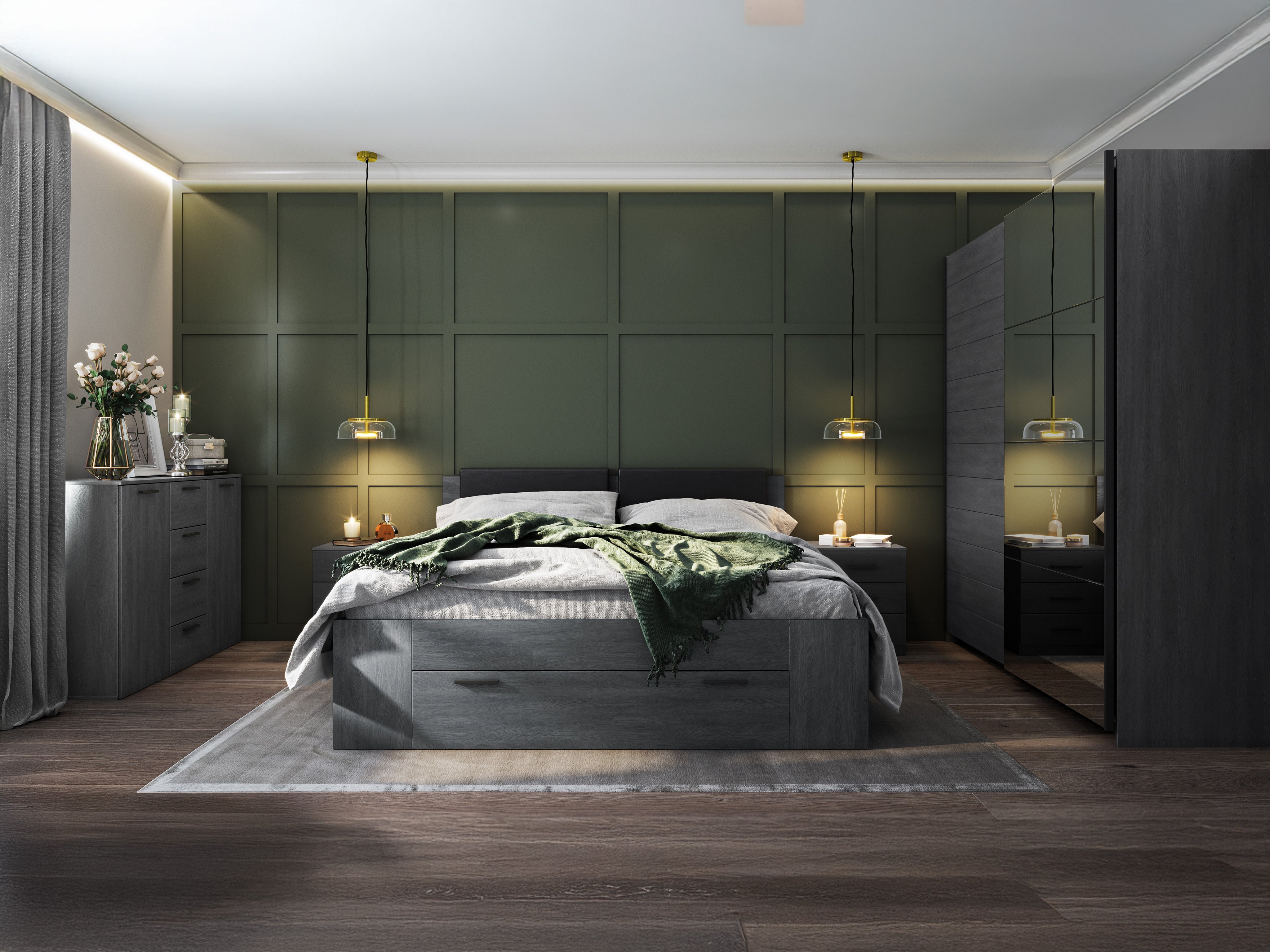 La collection de meubles de chambre modernes. Les meubles incarnent parfaitement la vision d'une chambre confortable, confortable et moderne. La collection se caractérise par des couleurs tendance, la fonctionnalité des pièces individuelles et des matériaux de haute qualité utilisés dans la production des meubles. La combinaison originale créera une atmosphère mystérieuse et transformera la chambre en votre petit royaume.