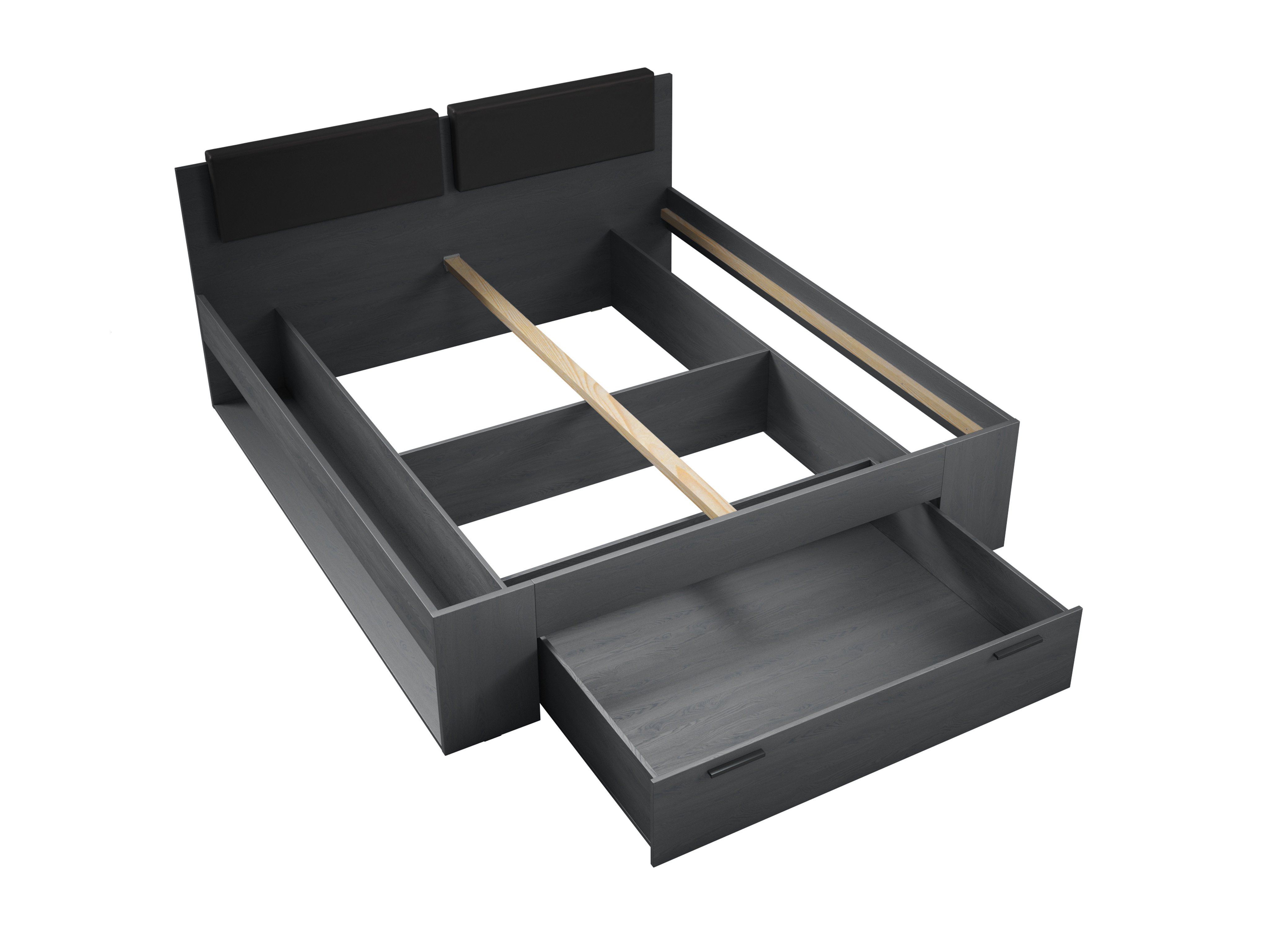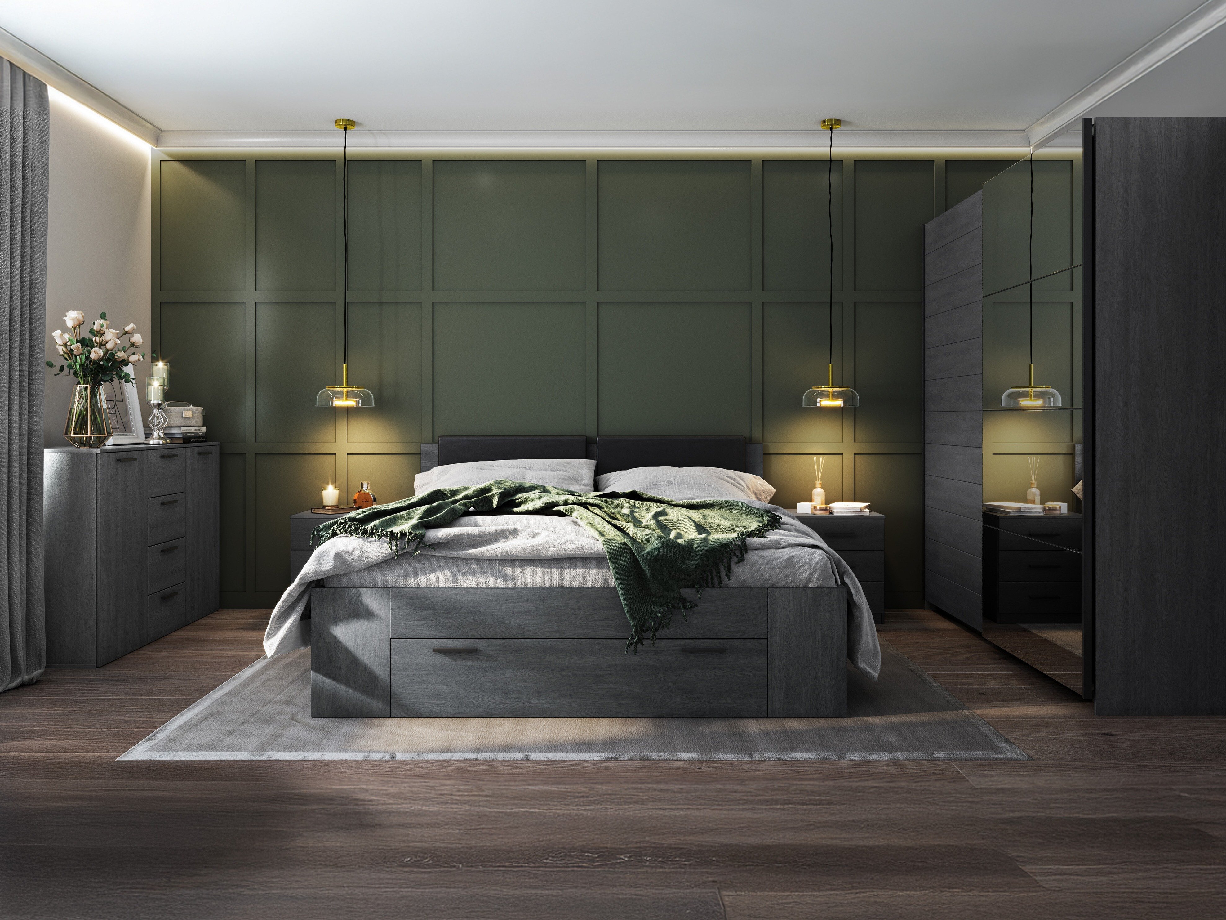 La collection de meubles de chambre modernes. Les meubles incarnent parfaitement la vision d'une chambre confortable, confortable et moderne. La collection se caractérise par des couleurs tendance, la fonctionnalité des pièces individuelles et des matériaux de haute qualité utilisés dans la production des meubles. La combinaison originale créera une atmosphère mystérieuse et transformera la chambre en votre petit royaume.