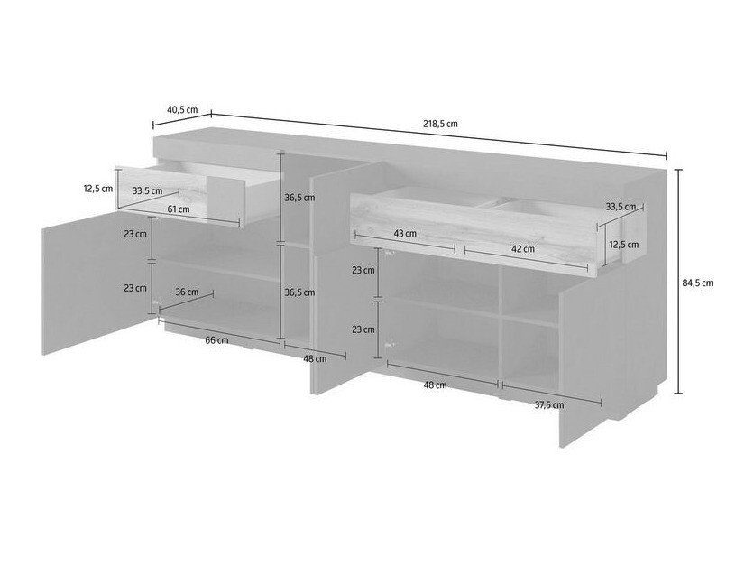 La collection combine des couleurs gris foncé ou blanc avec un décor couleur chêne. Vous pouvez également choisir une combinaison de couleurs de béton blanc et clair. Les surfaces blanches et brillantes apporteront une sensation de fraîcheur à votre maison, tandis que le gris matsoulignera le caractère unique de l'intérieur.