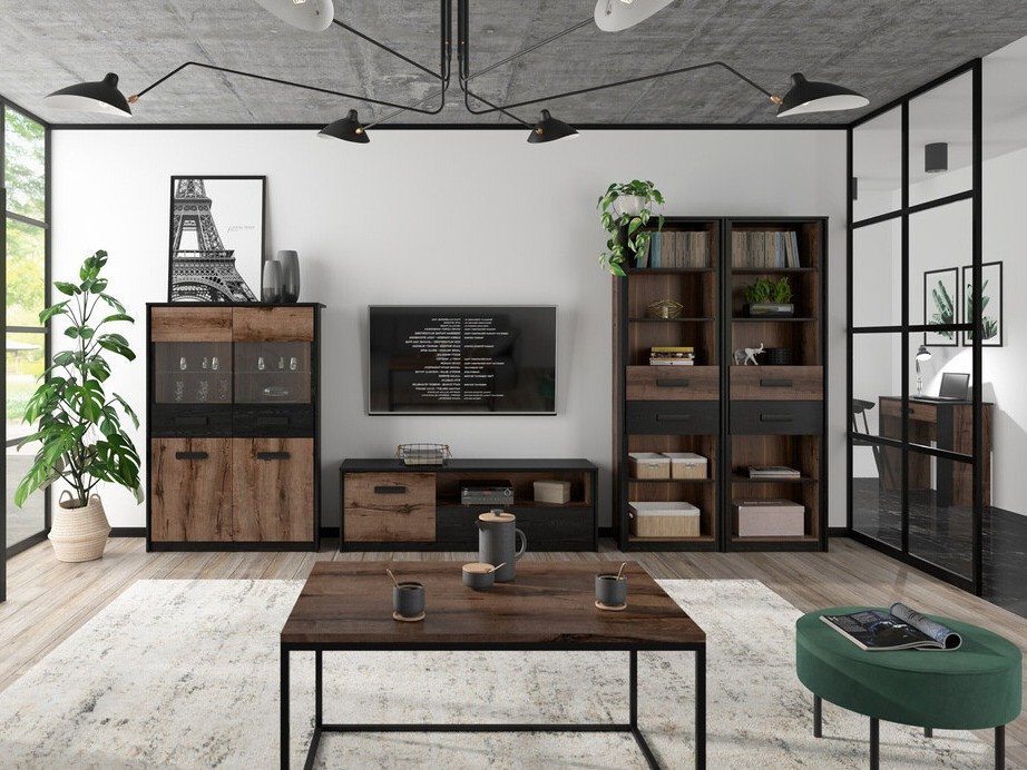 Les amateurs de style industriel doivent voir cette collection. Les façades de la collection sont dominées par les couleurs sombres du «Monastère» et du chêne noir. La couleur chêne foncé est parfaitement complétée par la garniture noire, qui confère au design du meuble un caractère unique. Des poignées noires assez massives ont été choisies, qui s'intègrent parfaitement dans l'ensemble. La couleur et les motifs du bois créent un design de mobilier industriel unique. La collection utilise du verre trempé, plus sûr et avec une plus grande résistance mécanique que le verre ordinaire. Pour l'intérieur de la chambre, vous pouvez choisir des lits de plusieurs tailles différentes avec ou sans sommier. L'ensemble de lit comprend un sommier tapissier avec un mécanisme de levage à gaz. Vous pouvez ajouter une touche supplémentaire à la collection en commandant en plus un éclairage LED économe en énergie. Les meubles de la collection ont des espaces de rangement ouverts et fermés, ce qui les rend adaptés au stockage pratique des effets personnels.