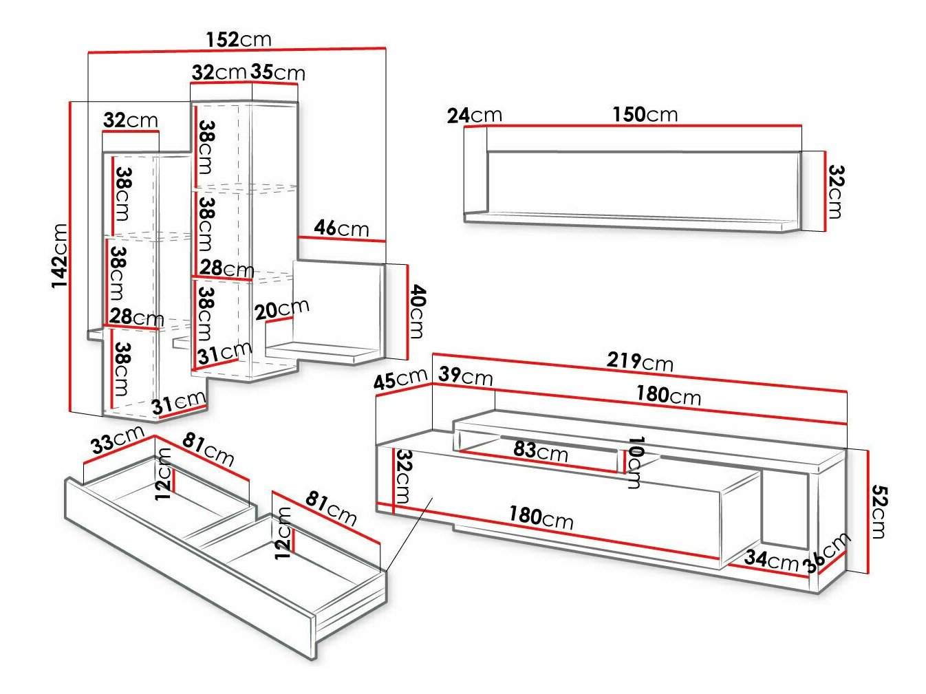 L'ensemble standard des meubles de salon comprend un éclairage d'étagère moderne et économe en énergie, qui aidera à créer une atmosphère chaleureuse et romantique dans votre maison.