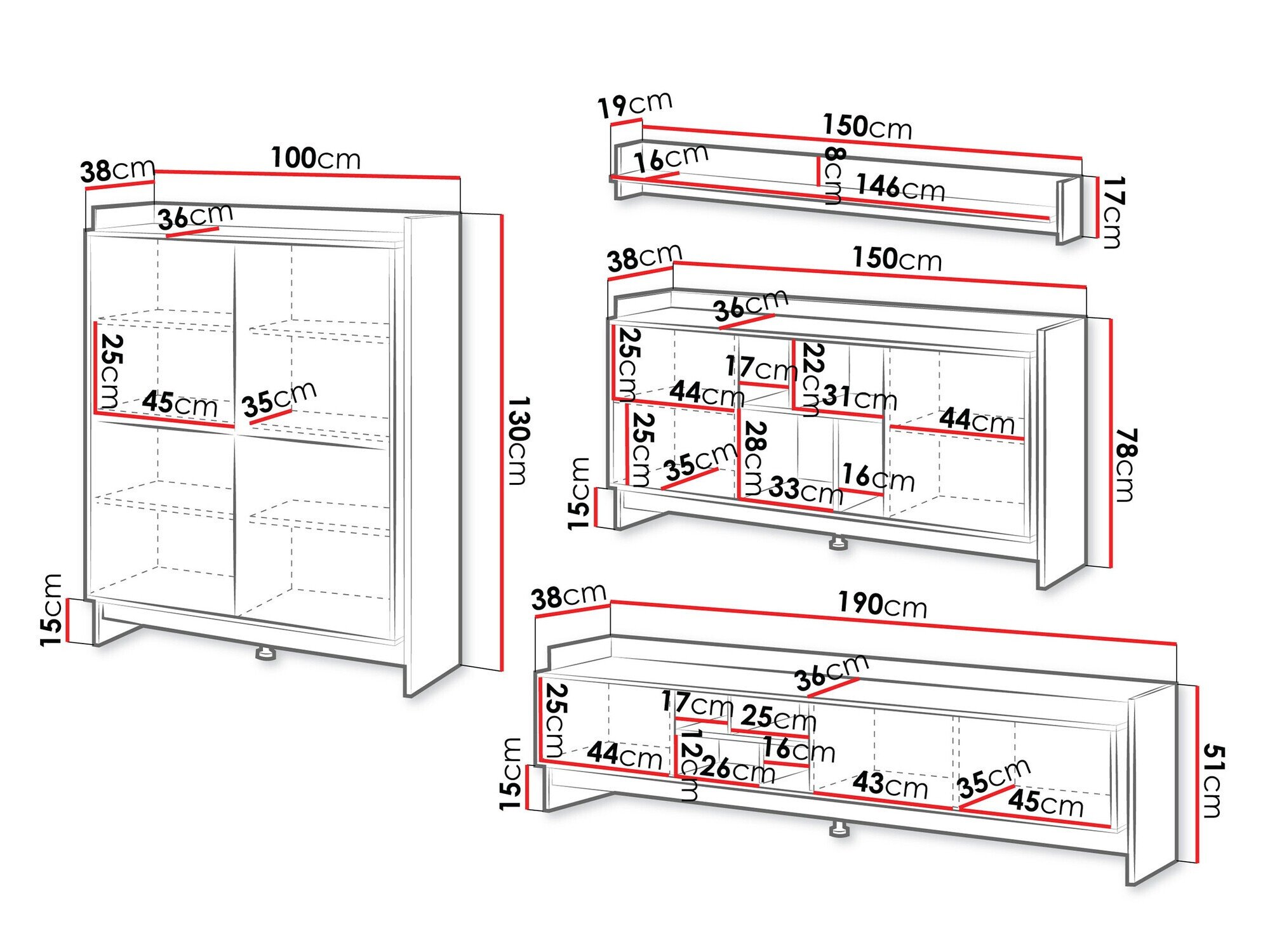 130 x 100 x 38; 78 x 150 x 38 cm