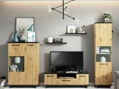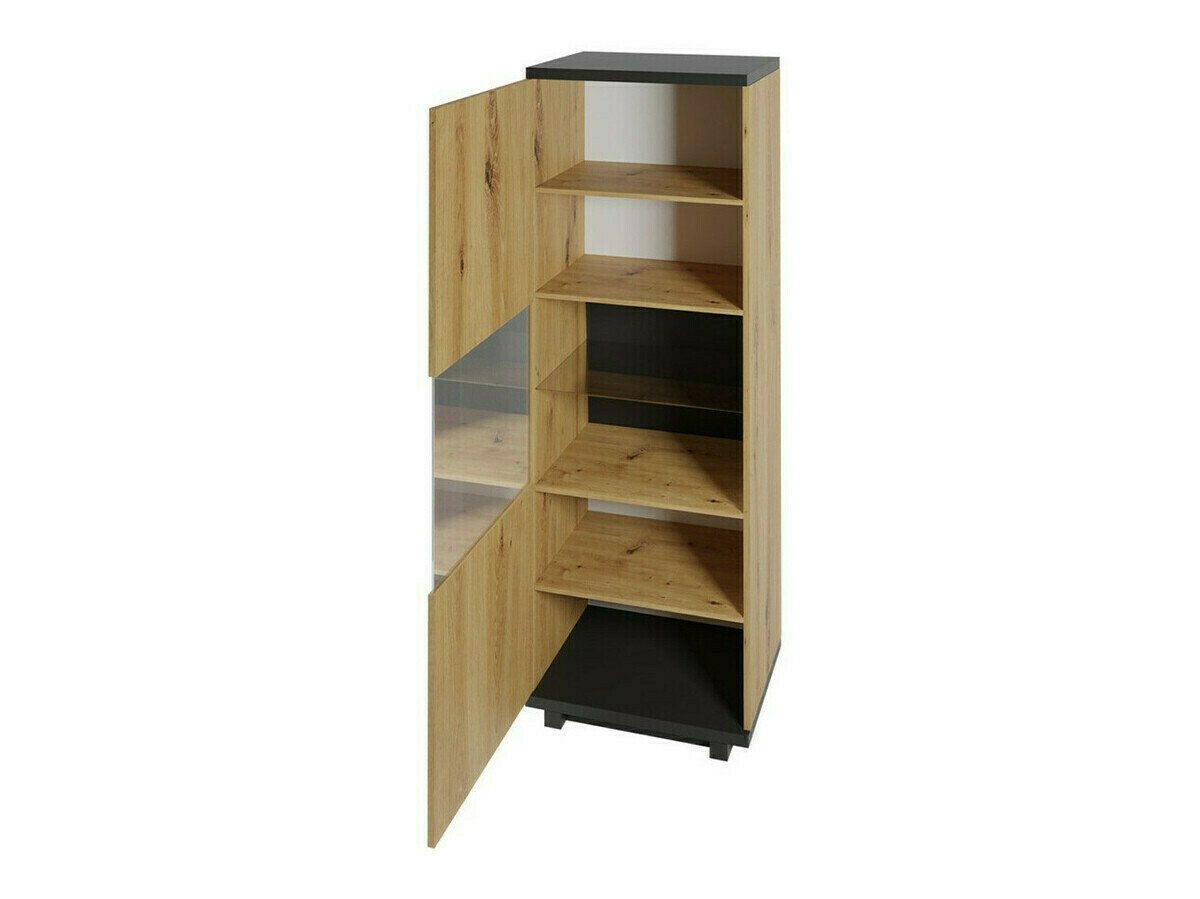 Cette collection de mobilier propose des meubles pour le salon et la chambre à coucher. Le design moderne et les lignes élégantes se complètent pour créer une combinaison parfaite. La collection attire le regard par ses couleurs chaudes et ses motifs bois. Les panneaux noirs mats sont assortis aux façades en chêne. Cette combinaison de couleurs se complète, soulignant la forme du meuble. Le verre trempé est utilisé dans les vitrines, qui est plus résistant que le verre ordinaire. Un lit au design exclusif deviendra le point culminant de la chambre. Tête de lit moelleuse, boîte à linge de lit, mécanisme de levage à gaz, tout ce dont vous avez besoin pour un repos parfait. Les bords des meubles de cette collection sont protégés par du ruban de finition, qui est généralement utilisé pour protéger les bords des panneaux.