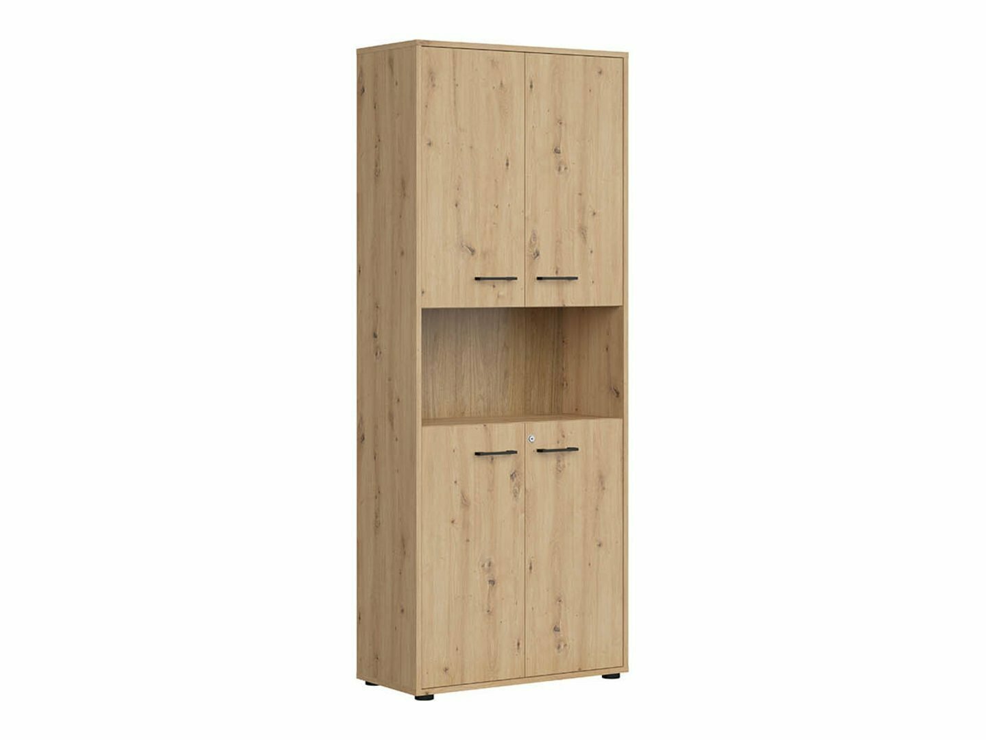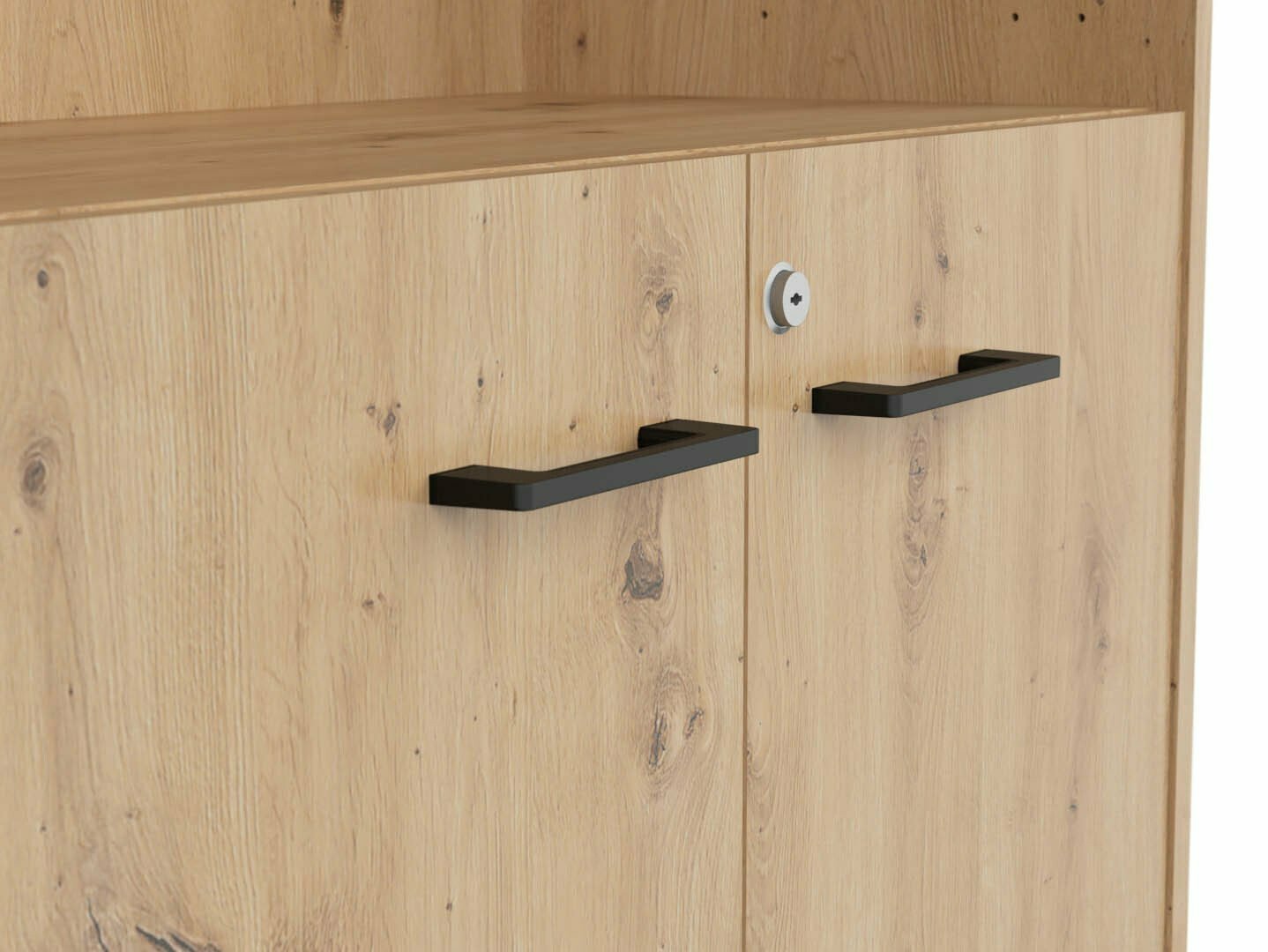 La combinaison de couleurs chêne « Artisan » et noir ajoute de la modernité au mobilier. Les poignées minimalistes en plastique noir s'intègrent parfaitement au design. Les meubles de la collection sont fabriqués en panneaux de particules stratifiés avec une surface résistante aux rayures. Grâce à ce film protecteur, les meubles deviennent non seulement résistants aux rayures, mais aussi mieux protégés de l'humidité ou des taches. Le mécanisme de fermeture silencieuse intégré aux meubles améliorera encore l'expérience de l'utilisateur et assurera l'ouverture et la fermeture silencieuses des portes et des tiroirs.