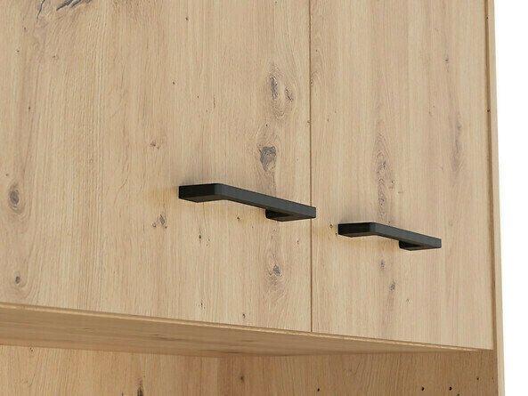 La combinaison de couleurs chêne « Artisan » et noir ajoute de la modernité au mobilier. Les poignées minimalistes en plastique noir s'intègrent parfaitement au design. Les meubles de la collection sont fabriqués en panneaux de particules stratifiés avec une surface résistante aux rayures. Grâce à ce film protecteur, les meubles deviennent non seulement résistants aux rayures, mais aussi mieux protégés de l'humidité ou des taches. Le mécanisme de fermeture silencieuse intégré aux meubles améliorera encore l'expérience de l'utilisateur et assurera l'ouverture et la fermeture silencieuses des portes et des tiroirs.