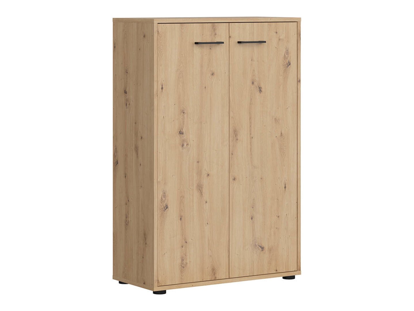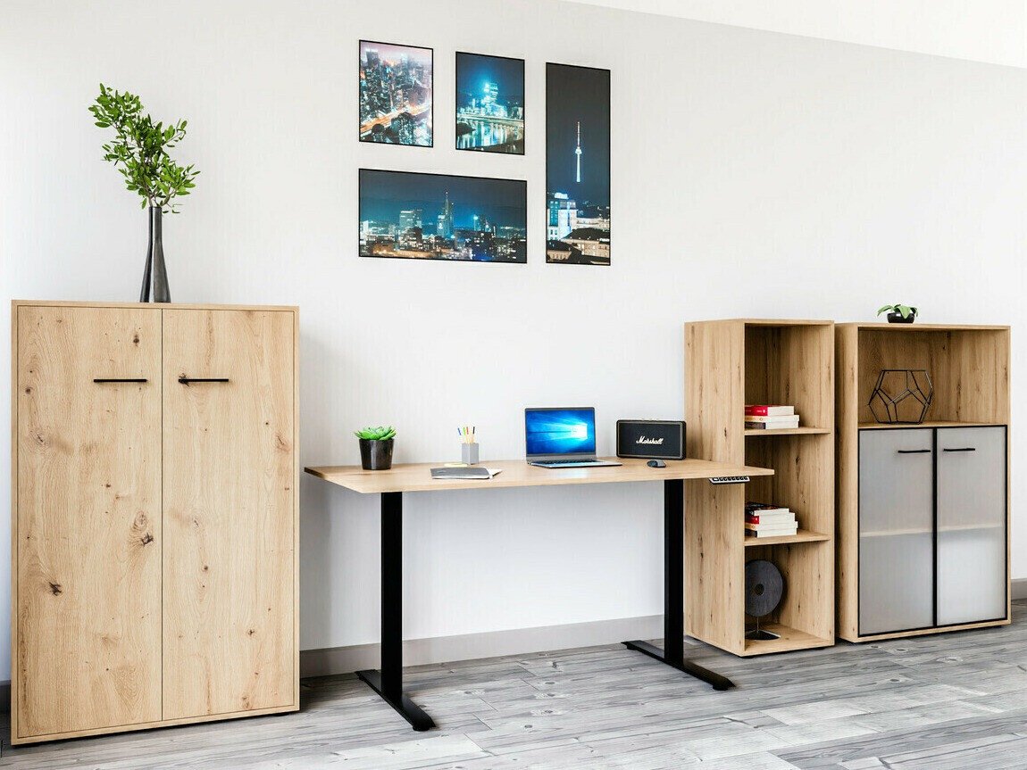 Si vous recherchez des meubles pour un bureau fonctionnel, cette collection est faite pour vous. La combinaison de couleurs chêne « Artisan » et noir ajoute de la modernité au mobilier. Les poignées minimalistes en plastique noir s'intègrent parfaitement au design. Les meubles de la collection sont fabriqués en panneaux de particules stratifiés avec une surface résistante aux rayures. Grâce à ce film protecteur, les meubles deviennent non seulement résistants aux rayures, mais aussi mieux protégés de l'humidité ou des taches. Le mécanisme de fermeture silencieuse intégré aux meubles améliorera encore l'expérience de l'utilisateur et assurera l'ouverture et la fermeture silencieuses des portes et des tiroirs. Le meuble dispose de zones de rangement ouvertes et fermées. Les objets personnels peuvent ainsi être rangés sur des étagères visibles ou cachés derrière des portes. La collection utilise du verre dépoli trempé et traité thermiquement. Sa résistance est 5 à 6 fois supérieure à celle du verre ordinaire, non traité thermiquement. Le verre est façonné par un cadre en aluminium noir. Les étagères de la collection sont universelles. Lors de leur montage, il est possible de décider dans quel sens la porte s'ouvrira. Les blocs-tiroirs utilisent des roulettes au lieu de pieds, ce qui rendra extrêmement facile et pratique le déplacement des meubles dans la pièce. De plus, les étagères à verrouillage permettront de ranger les objets personnels en toute sécurité. La base des bureaux de la collection est constituée d'un cadre métallique noir qui assure la stabilité. Pour ceux qui recherchent un bureau fonctionnel, la collection propose des bureaux dotés d'un mécanisme électrique de réglage de la hauteur. Il suffit d'appuyer sur quelques boutons pour que la hauteur de la table change et que vous puissiez travailler de manière encore plus confortable et ergonomique. >Avec des meubles fonctionnels et universels, l'aménagement d'un espace de bureau sera un plaisir.