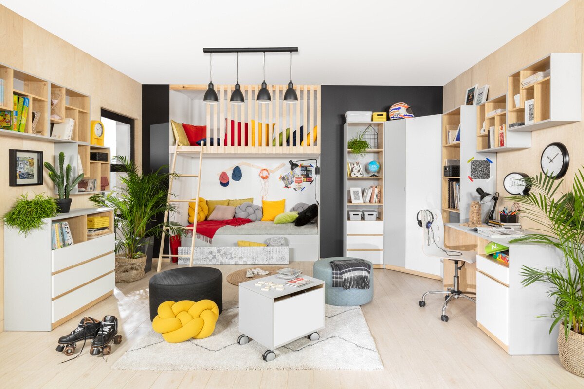 Dans une chambre d'enfant ou d'adolescent, il est important de maintenir un équilibre entre le design et la fonctionnalité. Dans cet espace, vous pouvez davantage exprimer votre imagination, sans avoir peur des couleurs vives ou d'autres éléments de design. L'innovation et la créativité vont de pair dans la collection. Les meubles de la collection ont des formes claires, des couleurs gris clair, chêne et blanc brillant. Le mobilier combine des couleurs neutres et des éléments colorés qui complètent le design comme un accent et se fondent parfaitement dans l'ensemble. Sans oublier les personnes qui ne sont pas de grands amateurs d'éléments brillants - vous trouverez également des meubles aux couleurs neutres dans la collection. La flexibilité sera assurée par des meubles spacieux avec des sections ouvertes et fermées. Les surfaces des meubles sont recouvertes d'un matériau incolore qui protège contre les petites rayures. Un mécanisme de fermeture silencieux est également intégré dans les portes et les tiroirs, ce qui apportera un confort supplémentaire lors de l'utilisation des meubles. La collection de meubles vous aidera à créer facilement un intérieur moderne et fonctionnel pour une jeune personne.