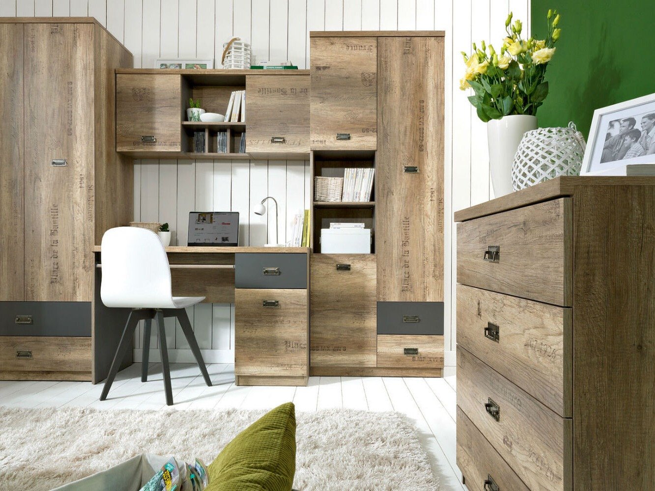 Collection de meubles - pour les passionés de style industriel. Le design soigné des meubles vous permettra de trouver de l'espace pour tous vos livres, cahiers ou fournitures scolaires. La surface des meubles est résistante aux petites rayures. Le caractère jeune des meubles est accentué par d'intéressantes poignées en métal. Les façades des meubles ornées de notes décoratives contribueront à créer une ambiance de style industriel dans la pièce. Les différents éléments de la collection peuvent être facilement combinés entre eux afin que leur agencement réponde parfaitement aux besoins individuels du jeune.