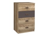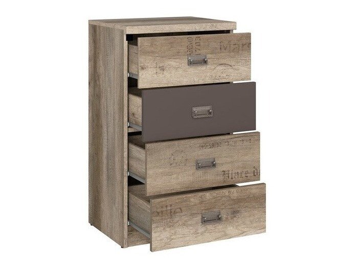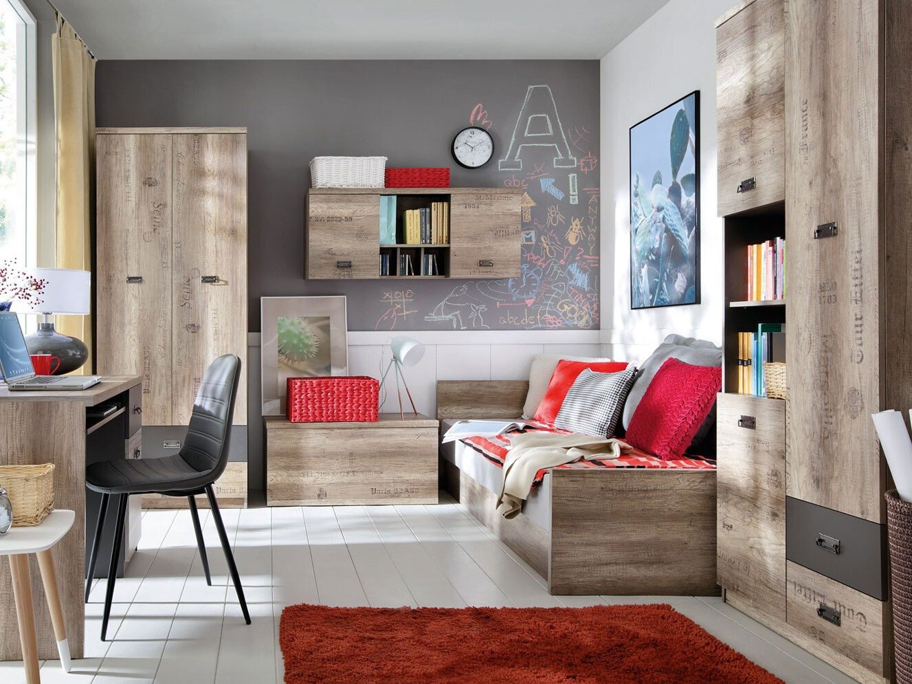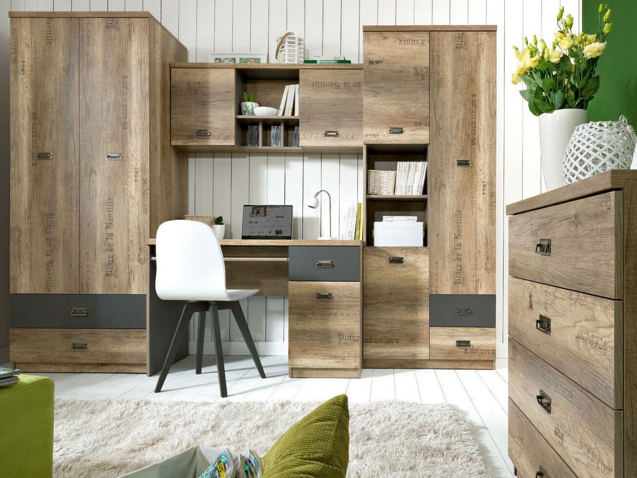 Collection de meubles - pour les passionés de style industriel. Le design soigné des meubles vous permettra de trouver de l'espace pour tous vos livres, cahiers ou fournitures scolaires. La surface des meubles est résistante aux petites rayures. Le caractère jeune des meubles est accentué par d'intéressantes poignées en métal. Les façades des meubles ornées de notes décoratives contribueront à créer une ambiance de style industriel dans la pièce. Les différents éléments de la collection peuvent être facilement combinés entre eux afin que leur agencement réponde parfaitement aux besoins individuels du jeune.