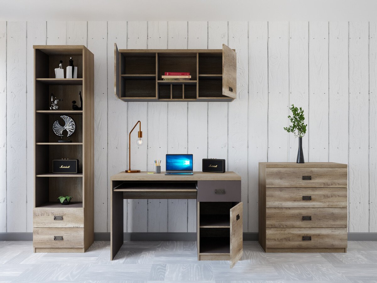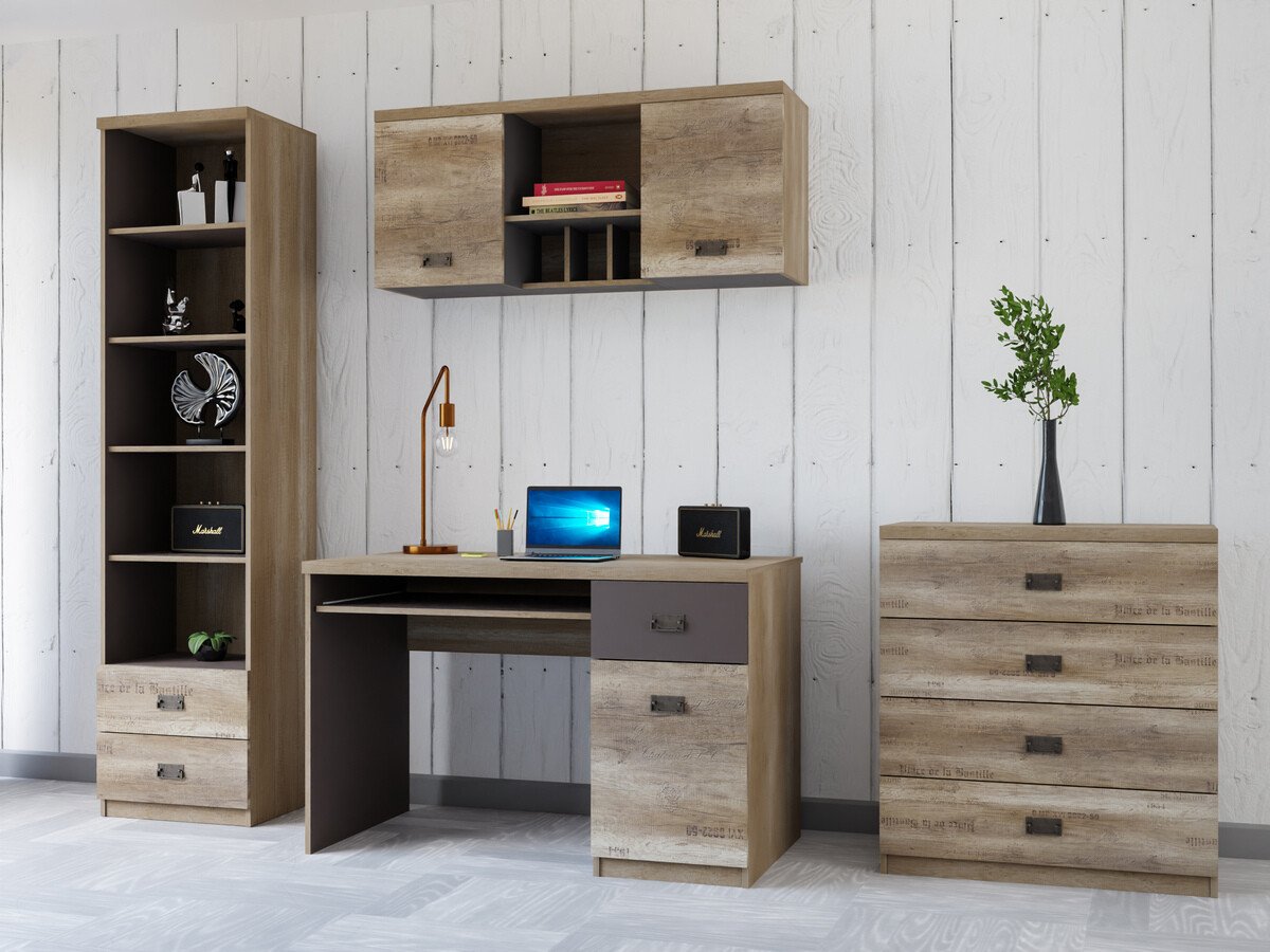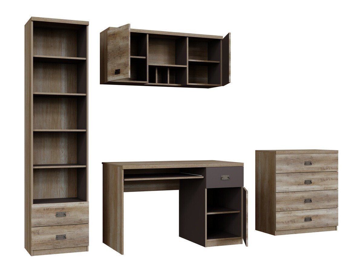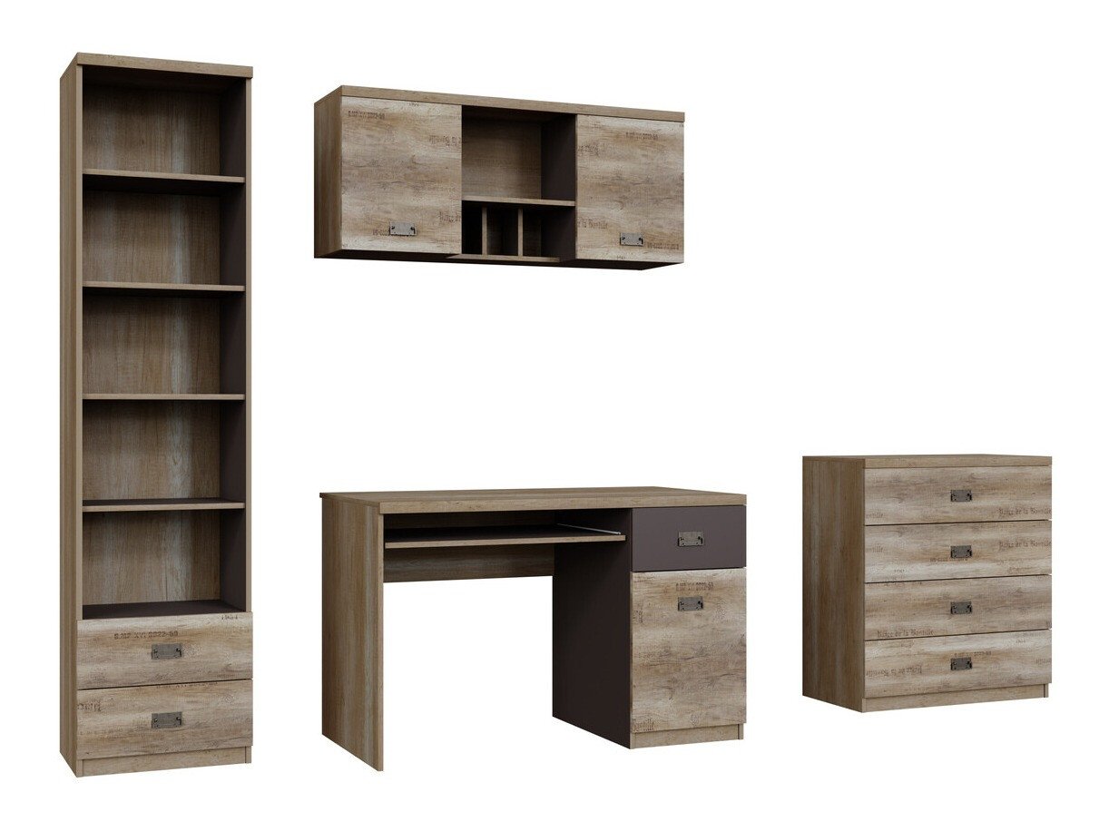 Collection de meubles - pour les passionés de style industriel. Le design soigné des meubles vous permettra de trouver de l'espace pour tous vos livres, cahiers ou fournitures scolaires. La surface des meubles est résistante aux petites rayures. Le caractère jeune des meubles est accentué par d'intéressantes poignées en métal. Les façades des meubles ornées de notes décoratives contribueront à créer une ambiance de style industriel dans la pièce. Les différents éléments de la collection peuvent être facilement combinés entre eux afin que leur agencement réponde parfaitement aux besoins individuels du jeune.