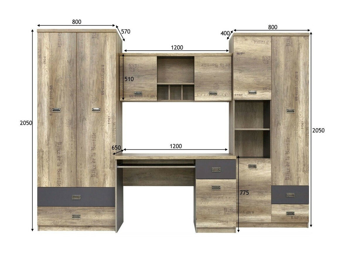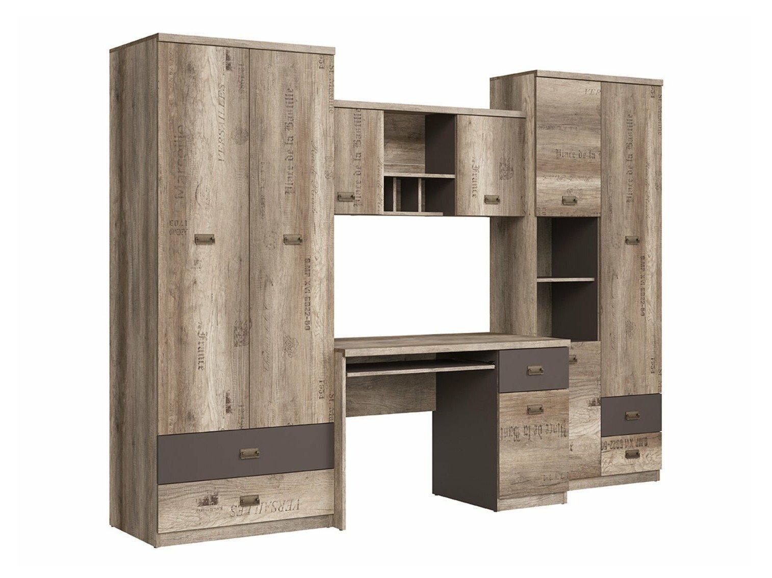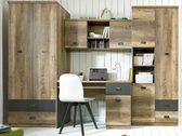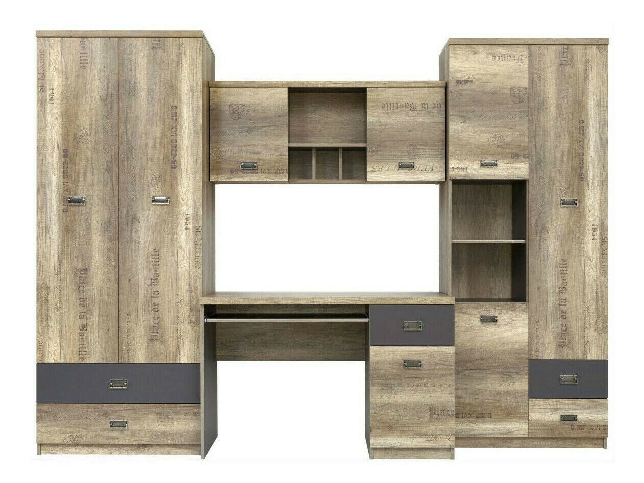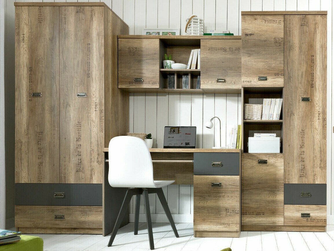 Collection de meubles - pour les passionés de style industriel. Le design soigné des meubles vous permettra de trouver de l'espace pour tous vos livres, cahiers ou fournitures scolaires. La surface des meubles est résistante aux petites rayures. Le caractère jeune des meubles est accentué par d'intéressantes poignées en métal. Les façades des meubles ornées de notes décoratives contribueront à créer une ambiance de style industriel dans la pièce. Les différents éléments de la collection peuvent être facilement combinés entre eux afin que leur agencement réponde parfaitement aux besoins individuels du jeune.