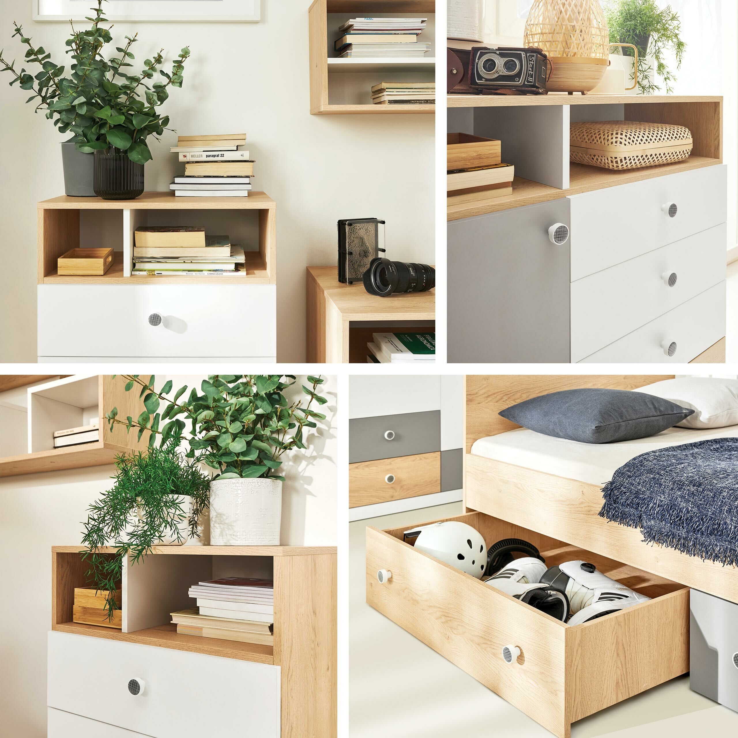 Meubler la chambre d'un adolescent peut devenir un véritable défi. C'est là que les collections de meubles pour la chambre d'un jeune homme deviennent pratiques. Les ensembles de meubles sont un choix pratique pour ceux qui veulent gagner du temps et recherchent des meubles au style intérieur solide. Cette collection de meubles fascine par ses couleurs pastel et ses formes simples. Le design des meubles combine trois couleurs : blanc, gris et couleur chêne. De petites poignées rondes ont été choisies pour souligner encore plus le design minimaliste et ludique des meubles. Les meubles de cette collection permettront de créer un espace où le jeune appréciera à la fois de passer du temps avec ses amis et d'étudier. Dans l'ensemble de meubles, vous trouverez une étagère, un lit, une commode, une armoire, et tout ce dont vous pourriez avoir besoin dans la chambre d'un jeune. La conception du meuble est bien pensée : vous trouverez ici des compartiments, des étagères et des tiroirs de différentes tailles, qui deviendront une solution très pratique pour garder la chambre en ordre. Les bords du meuble sont recouverts d'un ruban de finition, fabriqué en plastique résistant, qui est généralement utilisé pour protéger les bords des panneaux. Le design de cette collection de meubles est parfait pour les enfants de tous âges.