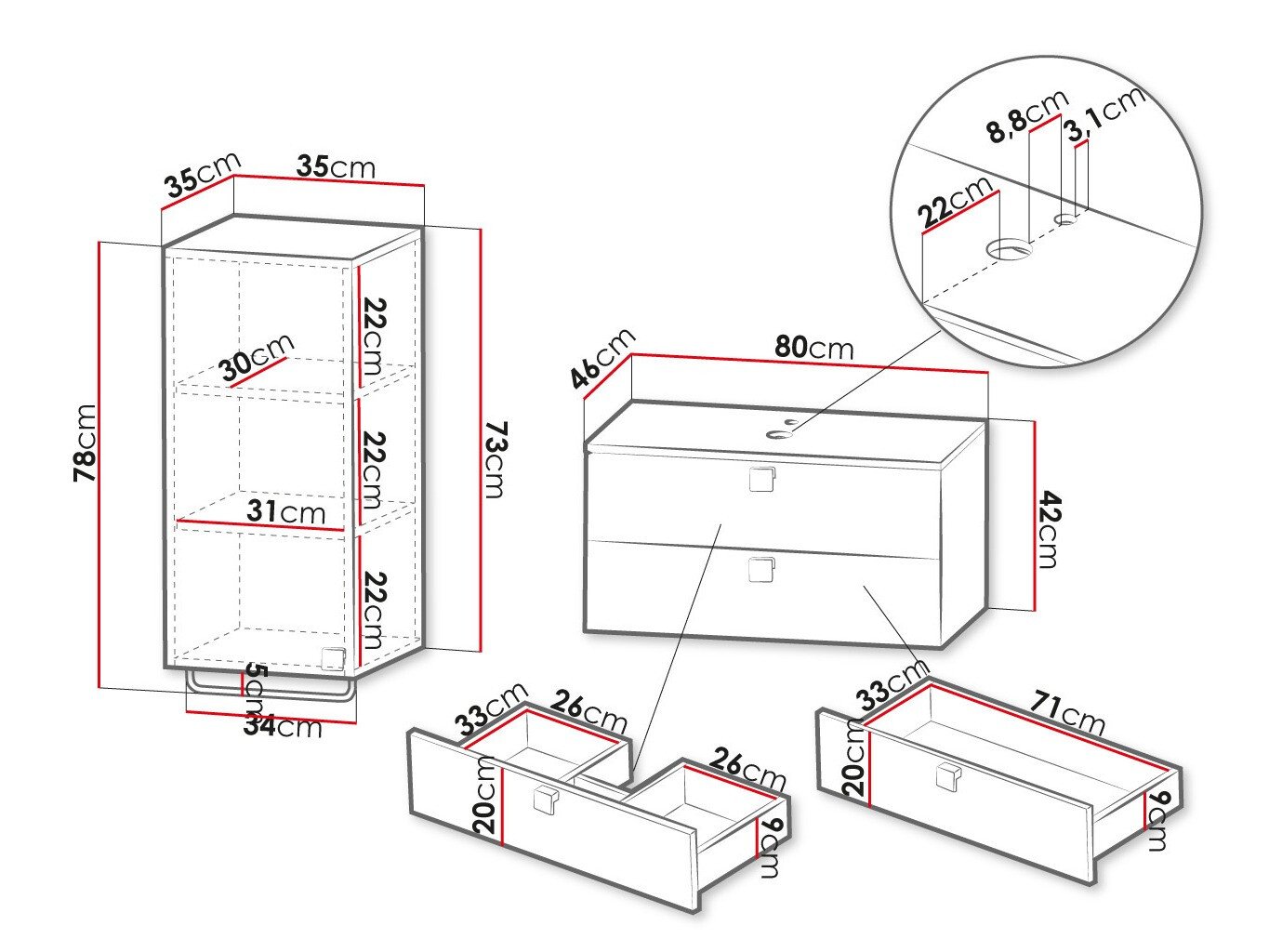 Informations sur la fixation au mur. Les meubles suspendus ou fixés au mur ne sont pas livrés avec des vis de fixation, vous devez donc vous en occuper individuellement. Les différents types de murs nécessitent des vis spécifiques, voire des profondeurs de perçage différentes. Choisissez le matériel de fixation en fonction du poids du meuble et du type de mur (cloison sèche, maçonnerie, bois, etc.). Pour garantir la qualité et la sécurité, utilisez des vis conçues spécifiquement pour votre type de mur.