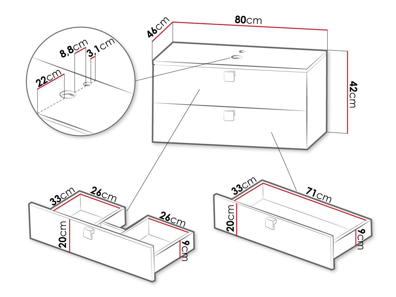 Informations sur la fixation au mur. Les meubles suspendus ou fixés au mur ne sont pas livrés avec des vis de fixation, vous devez donc vous en occuper individuellement. Les différents types de murs nécessitent des vis spécifiques, voire des profondeurs de perçage différentes. Choisissez le matériel de fixation en fonction du poids du meuble et du type de mur (cloison sèche, maçonnerie, bois, etc.). Pour garantir la qualité et la sécurité, utilisez des vis conçues spécifiquement pour votre type de mur.