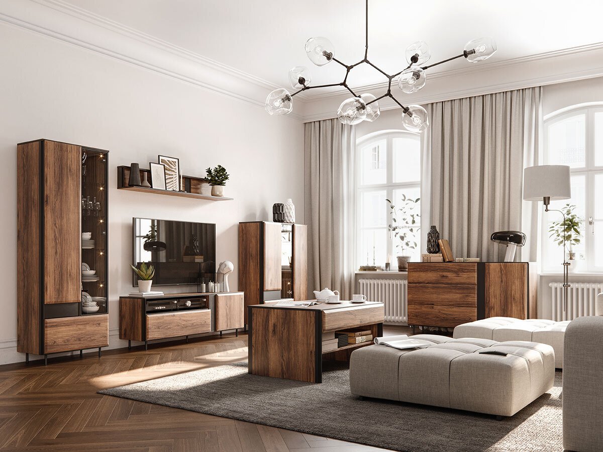 Lorsque vous voyez la collection, le design extrêmement élégant des meubles attire le regard. La combinaison des couleurs noir et chêne «Catania» est particulièrement luxueuse et diffuse en même temps chaleur et confort. Les façades couleur bois ne sont pas surchargées de détails inutiles et les bordures en métal créent une ambiance de design moderne. Les lignes et les silhouettes sont nettes, pas surchargées de détails inutiles, tout se fond bien dans l'ensemble. Le verre trempé, utilisé dans les vitrines, est un verre traité thermiquement dont la résistance mécanique est 5 à 6 fois supérieure à celle du verre ordinaire. L'éclairage LED vous aidera à animer les vitrines, que vous pouvez en outre commander et intégrer dans les vitrines. Les petits détails, tels que les pieds de meubles en métal, s'intègrent parfaitement dans le design des meubles. Le meuble a un mécanisme de fermeture silencieux intégré, grâce auquel les portes et les tiroirs sont arrêtés juste avant la fermeture et sont tirés lentement, de sorte qu'aucun bruit ne soit fait. Le mécanisme«Push to open» vous permet d'ouvrir les portes et les tiroirs d'une seule touche.