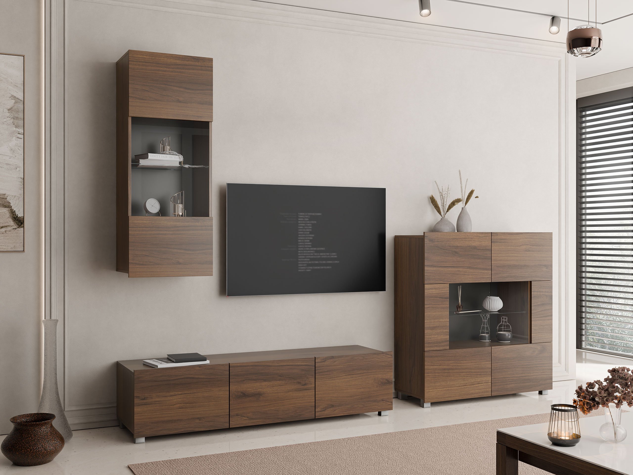 Cette collection de meubles est conçue pour s'adapter au rythme de la vie moderne, où fonctionnalité et esthétique vont de pair. Ses lignes épurées, ses formes contemporaines et ses détails subtils vous permettent de créer facilement un espace confortable et authentique où vous aurez plaisir à rentrer chez vous. La collection comprend des meubles TV, des ensembles de salon, des armoires murales, des lits et des bureaux, tous conçus avec soin pour s'harmoniser parfaitement entre eux. Ces pièces s'adaptent sans effort à différents intérieurs, offrant des solutions polyvalentes pour les espaces compacts ou formant des combinaisons audacieuses et distinctives dans les pièces plus grandes. Certains modèles sont équipés d'un éclairage LED intégré à faible consommation d'énergie, qui ajoute de la chaleur et de l'ambiance le soir. Les éléments en verre trempé améliorent à la fois la durabilité et le design, apportant une touche raffinée de caractère. Cette collection s'intègre facilement dans une variété d'intérieurs, contribuant à créer un espace de vie accueillant et élégant, un lieu où se réunir, faire une pause et simplement profiter de la vie.