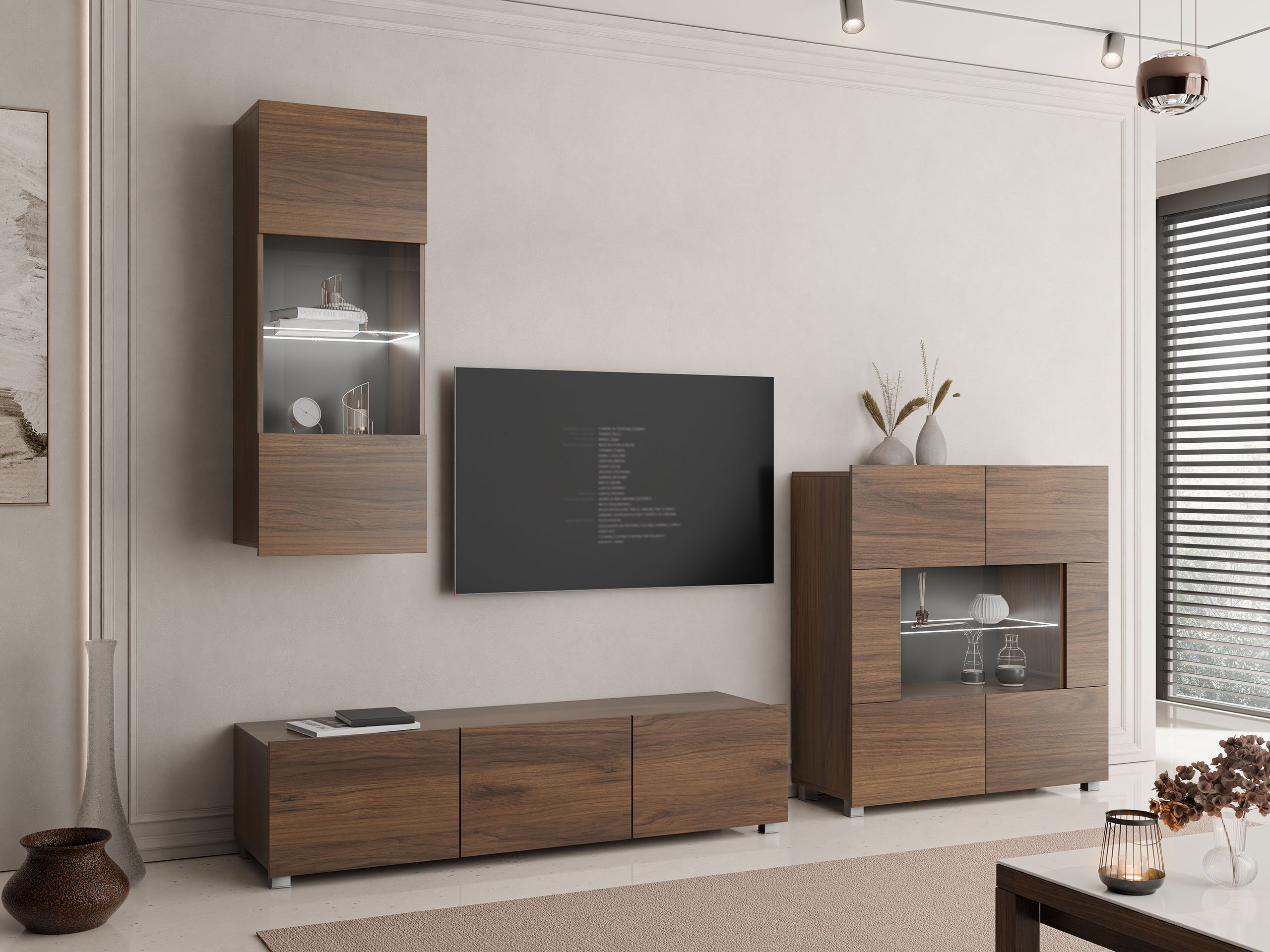 Cette collection de meubles est conçue pour s'adapter au rythme de la vie moderne, où fonctionnalité et esthétique vont de pair. Ses lignes épurées, ses formes contemporaines et ses détails subtils vous permettent de créer facilement un espace confortable et authentique où vous aurez plaisir à rentrer chez vous. La collection comprend des meubles TV, des ensembles de salon, des armoires murales, des lits et des bureaux, tous conçus avec soin pour s'harmoniser parfaitement entre eux. Ces pièces s'adaptent sans effort à différents intérieurs, offrant des solutions polyvalentes pour les espaces compacts ou formant des combinaisons audacieuses et distinctives dans les pièces plus grandes. Certains modèles sont équipés d'un éclairage LED intégré à faible consommation d'énergie, qui ajoute de la chaleur et de l'ambiance le soir. Les éléments en verre trempé améliorent à la fois la durabilité et le design, apportant une touche raffinée de caractère. Cette collection s'intègre facilement dans une variété d'intérieurs, contribuant à créer un espace de vie accueillant et élégant, un lieu où se réunir, faire une pause et simplement profiter de la vie.