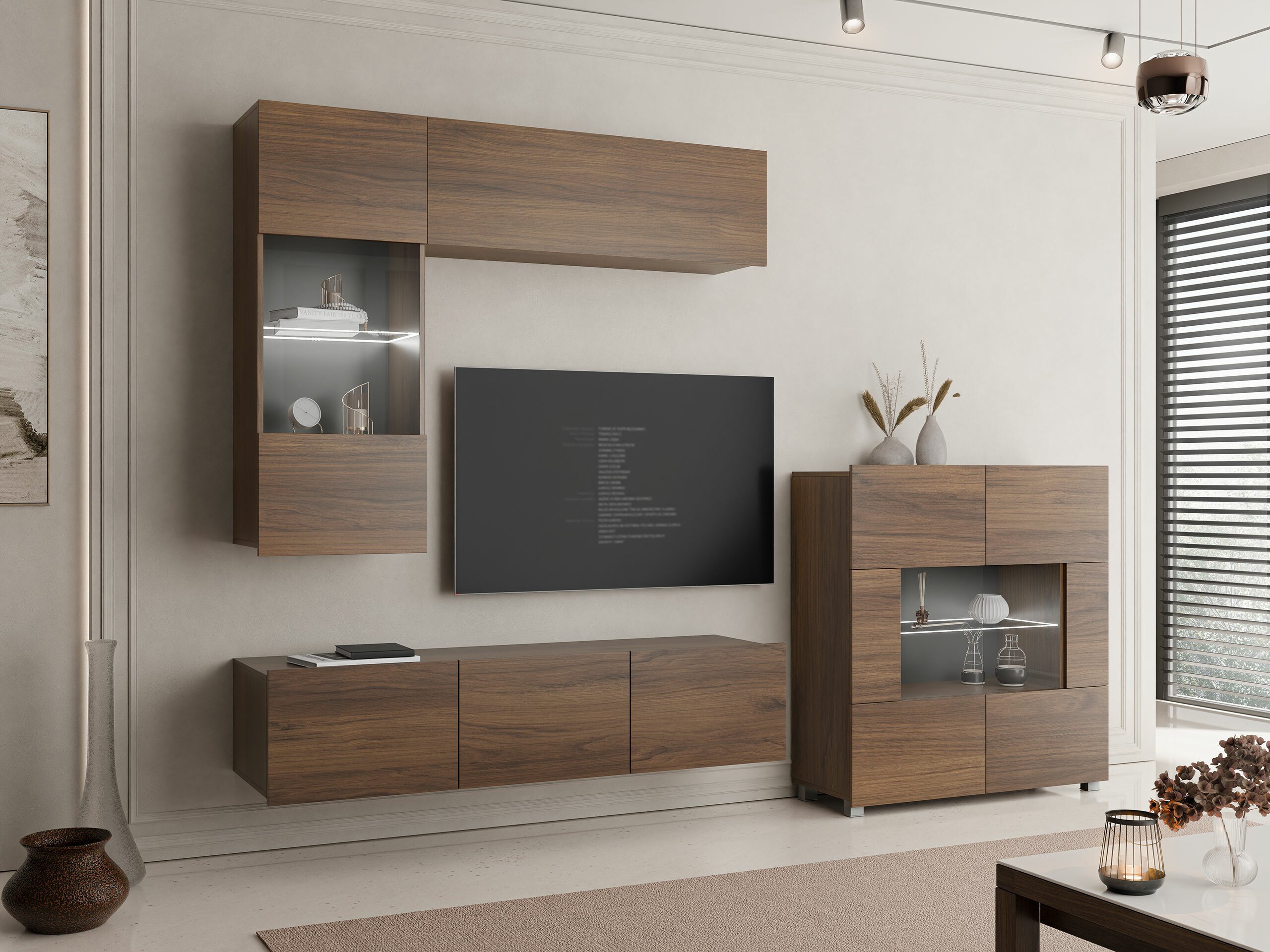 Cette collection de meubles est conçue pour s'adapter au rythme de la vie moderne, où fonctionnalité et esthétique vont de pair. Ses lignes épurées, ses formes contemporaines et ses détails subtils vous permettent de créer facilement un espace confortable et authentique où vous aurez plaisir à rentrer chez vous. La collection comprend des meubles TV, des ensembles de salon, des armoires murales, des lits et des bureaux, tous conçus avec soin pour s'harmoniser parfaitement entre eux. Ces pièces s'adaptent sans effort à différents intérieurs, offrant des solutions polyvalentes pour les espaces compacts ou formant des combinaisons audacieuses et distinctives dans les pièces plus grandes. Certains modèles sont équipés d'un éclairage LED intégré à faible consommation d'énergie, qui ajoute de la chaleur et de l'ambiance le soir. Les éléments en verre trempé améliorent à la fois la durabilité et le design, apportant une touche raffinée de caractère. Cette collection s'intègre facilement dans une variété d'intérieurs, contribuant à créer un espace de vie accueillant et élégant, un lieu où se réunir, faire une pause et simplement profiter de la vie.