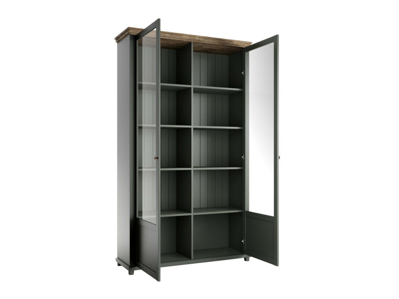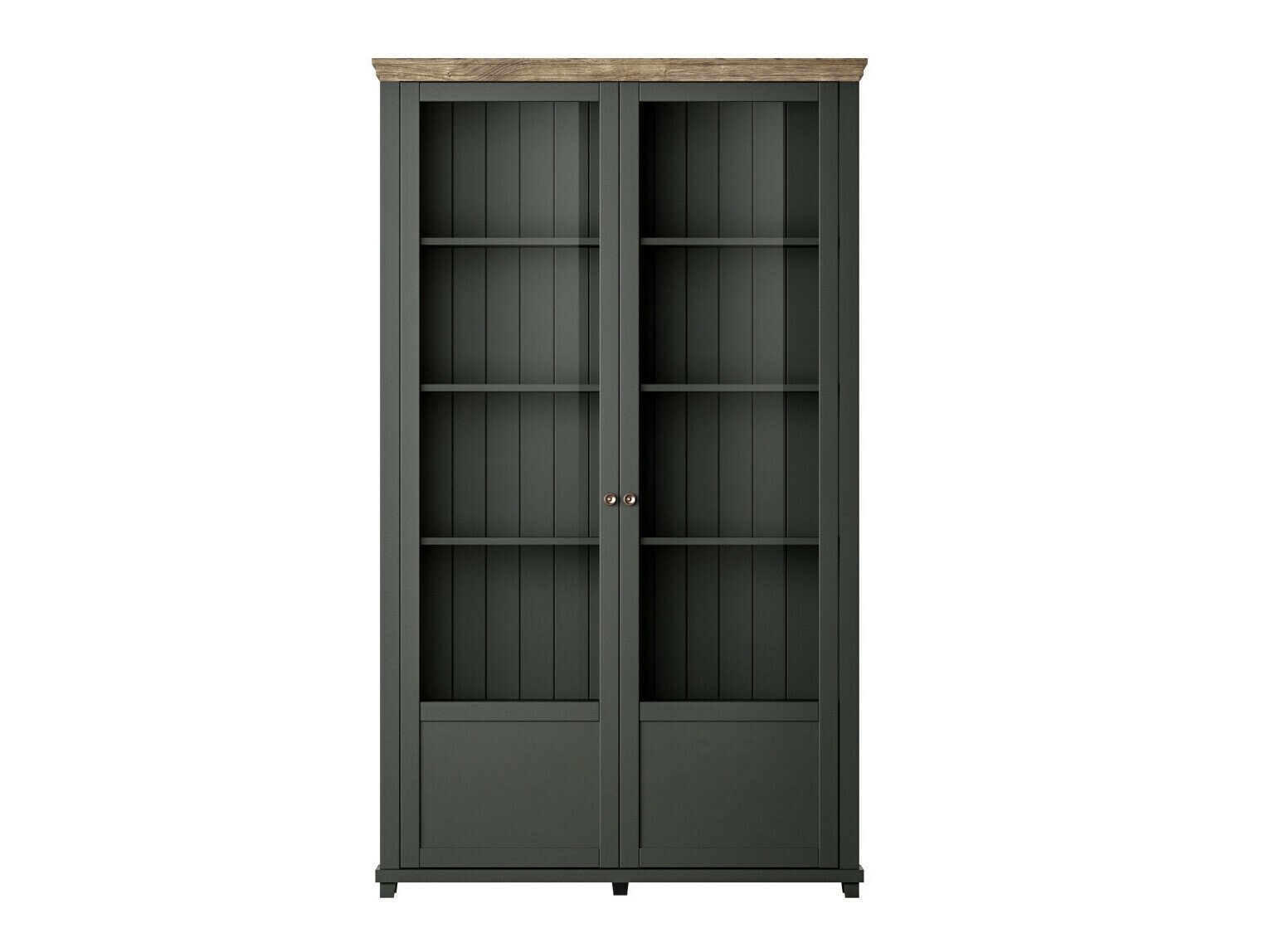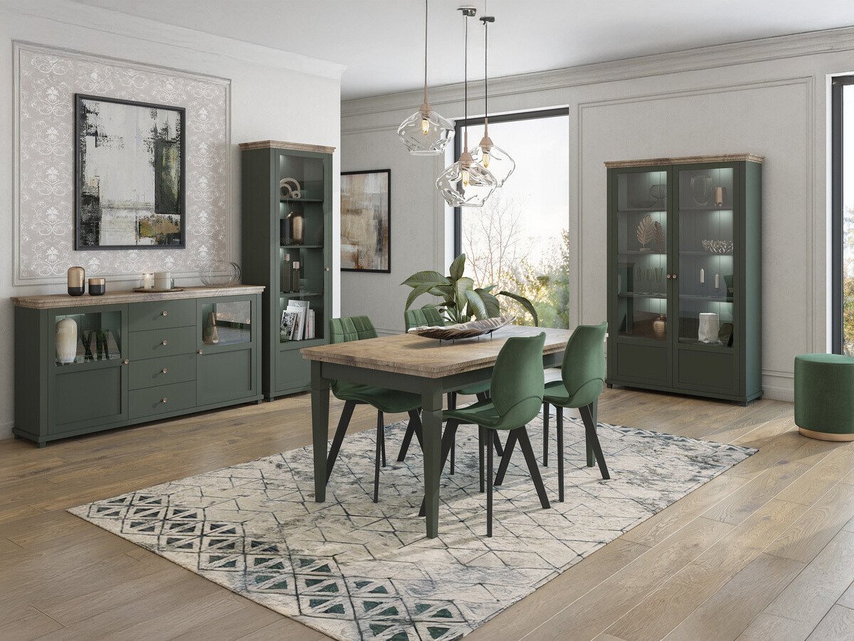 Cette collection de meubles reflète le style des classiques intemporels complétés par des combinaisons de couleurs modernes. Les petites poignées en métal et les pieds en plastique combinés aux couleurs vert foncé du chêne «Lefkas» ou du frêne blanchi aideront à garder le design de la pièce épuré. La collection propose des meubles pratiques qui permettent de ranger des objets. Les vitrines sont idéales pour la vaisselle, les ustensiles de cuisine ou les décorations, tandis que les commodes peuvent être utilisées pour ranger des objets que l'on ne souhaite pas voir tous les jours. Un éclairage LED, qui peut être commandé séparément, permet d'ajouter un charme supplémentaire aux meubles. La collection est certifiée FSC, ce qui garantit que les meubles sont fabriqués à partir de bois biologique provenant de forêts économiquement avantageuses.