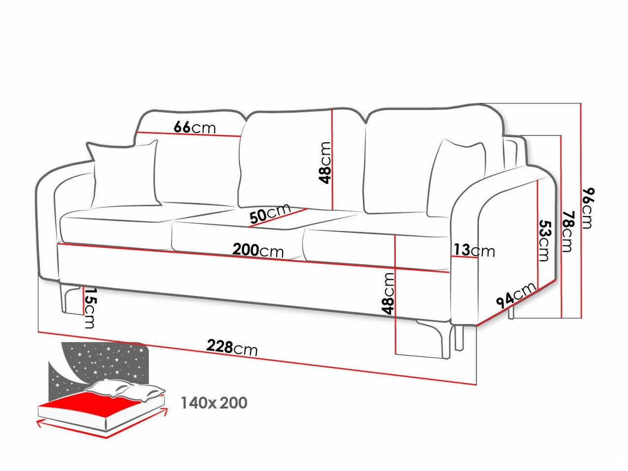96 cm  228 cm  94 cm