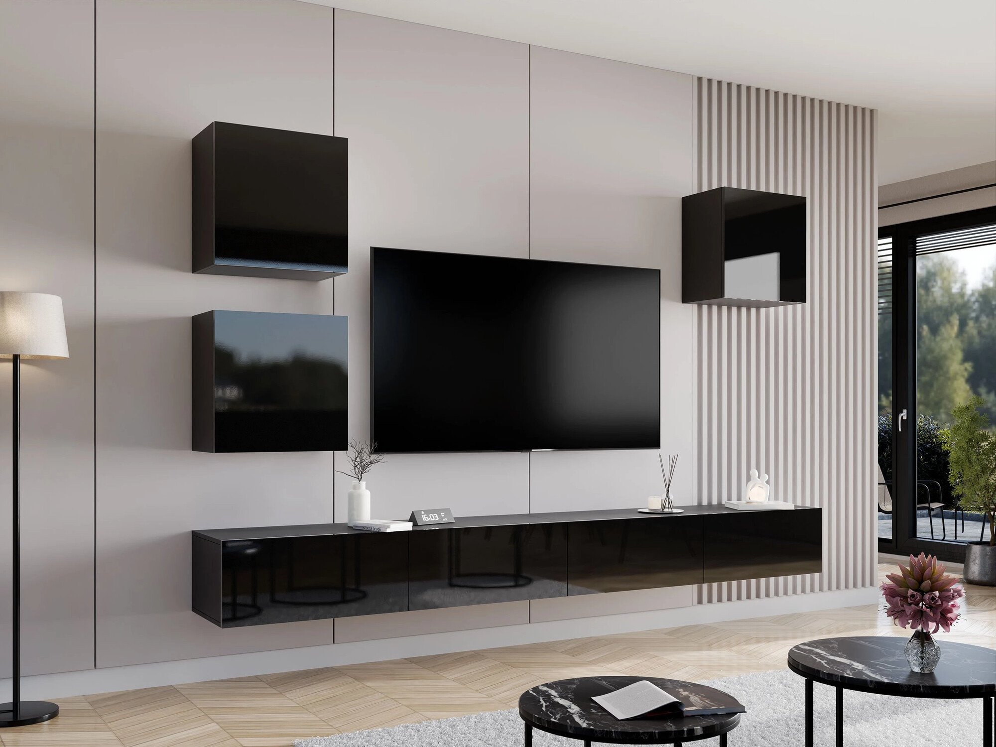 Cette collection de meubles modernes crée une esthétique harmonieuse dans le salon tout en améliorant la sensation d'espace. Les formes minimalistes et les choix de conception fonctionnels contribuent à créer un cadre confortable et élégant. Des meubles de salon aux étagères murales, les pièces de cette collection sont conçues pour s'harmoniser entre elles, ce qui permet de créer facilement des solutions pratiques pour les petits espaces ou des combinaisons plus audacieuses dans les grandes pièces. Certains modèles intègrent un éclairage LED économe en énergie pour ajouter de la chaleur, tandis que les éléments en verre trempé contribuent à un look raffiné et léger. Un mécanisme d'ouverture à une touche sur les portes préserve la silhouette épurée et minimaliste du mobilier. Cette collection polyvalente s'adapte sans effort à une variété de styles d'intérieur, contribuant à créer un espace de vie contemporain et accueillant.