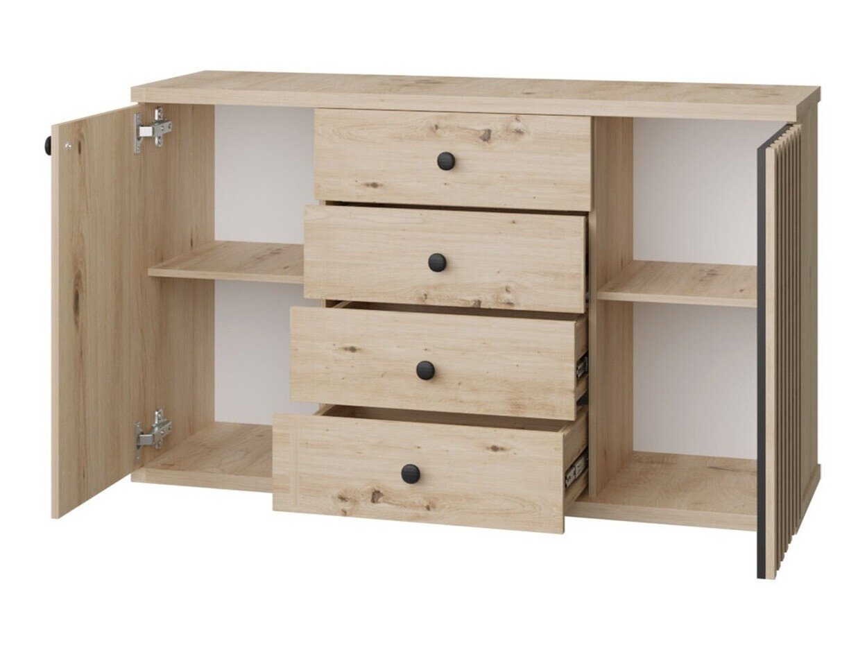 La couleur chêne « Artisan » domine dans la collection et des notes de motifs bois sont visibles sur les façades. Les petites poignées en métal noir se fondent parfaitement dans l'ensemble du design. Les lignes verticales décoratives deviennent un accent de la collection. Cette solution confère au meuble un caractère exclusif et remplace également les poignées du meuble en permettant l'ouverture des portes du meuble. Les meubles ne manquent pas d'étagères et de tiroirs, ce qui aidera à ranger les choses les plus importantes. Un mécanisme de fermeture silencieux est installé dans le meuble, ce qui est spécial car il protège les portes et les tiroirs d'une fermeture rapide. Grâce à des amortisseurs spéciaux, les portes et les tiroirs sont arrêtés juste avant la fermeture et se rétractent lentement sans faire de bruit. D'une commode à une vitrine, d'un meuble TV à une étagère suspendue, dans cette collection, vous trouverez une variété de meubles pour le salon. Si vous souhaitez créer un intérieur complet sans trop d'efforts, choisissez un ensemble de meubles.