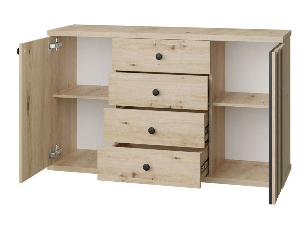 La couleur chêne « Artisan » domine dans la collection et des notes de motifs bois sont visibles sur les façades. Les petites poignées en métal noir se fondent parfaitement dans l'ensemble du design. Les lignes verticales décoratives deviennent un accent de la collection. Cette solution confère au meuble un caractère exclusif et remplace également les poignées du meuble en permettant l'ouverture des portes du meuble. Les meubles ne manquent pas d'étagères et de tiroirs, ce qui aidera à ranger les choses les plus importantes. Un mécanisme de fermeture silencieux est installé dans le meuble, ce qui est spécial car il protège les portes et les tiroirs d'une fermeture rapide. Grâce à des amortisseurs spéciaux, les portes et les tiroirs sont arrêtés juste avant la fermeture et se rétractent lentement sans faire de bruit. D'une commode à une vitrine, d'un meuble TV à une étagère suspendue, dans cette collection, vous trouverez une variété de meubles pour le salon. Si vous souhaitez créer un intérieur complet sans trop d'efforts, choisissez un ensemble de meubles.