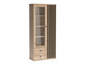 La couleur chêne « Artisan » domine dans la collection et des notes de motifs bois sont visibles sur les façades. Les petites poignées en métal noir se fondent parfaitement dans l'ensemble du design. Les lignes verticales décoratives deviennent un accent de la collection. Cette solution confère au meuble un caractère exclusif et remplace également les poignées du meuble en permettant l'ouverture des portes du meuble. Les meubles ne manquent pas d'étagères et de tiroirs, ce qui aidera à ranger les choses les plus importantes. Un mécanisme de fermeture silencieux est installé dans le meuble, ce qui est spécial car il protège les portes et les tiroirs d'une fermeture rapide. Grâce à des amortisseurs spéciaux, les portes et les tiroirs sont arrêtés juste avant la fermeture et se rétractent lentement sans faire de bruit. D'une commode à une vitrine, d'un meuble TV à une étagère suspendue, dans cette collection, vous trouverez une variété de meubles pour le salon. Si vous souhaitez créer un intérieur complet sans trop d'efforts, choisissez un ensemble de meubles.