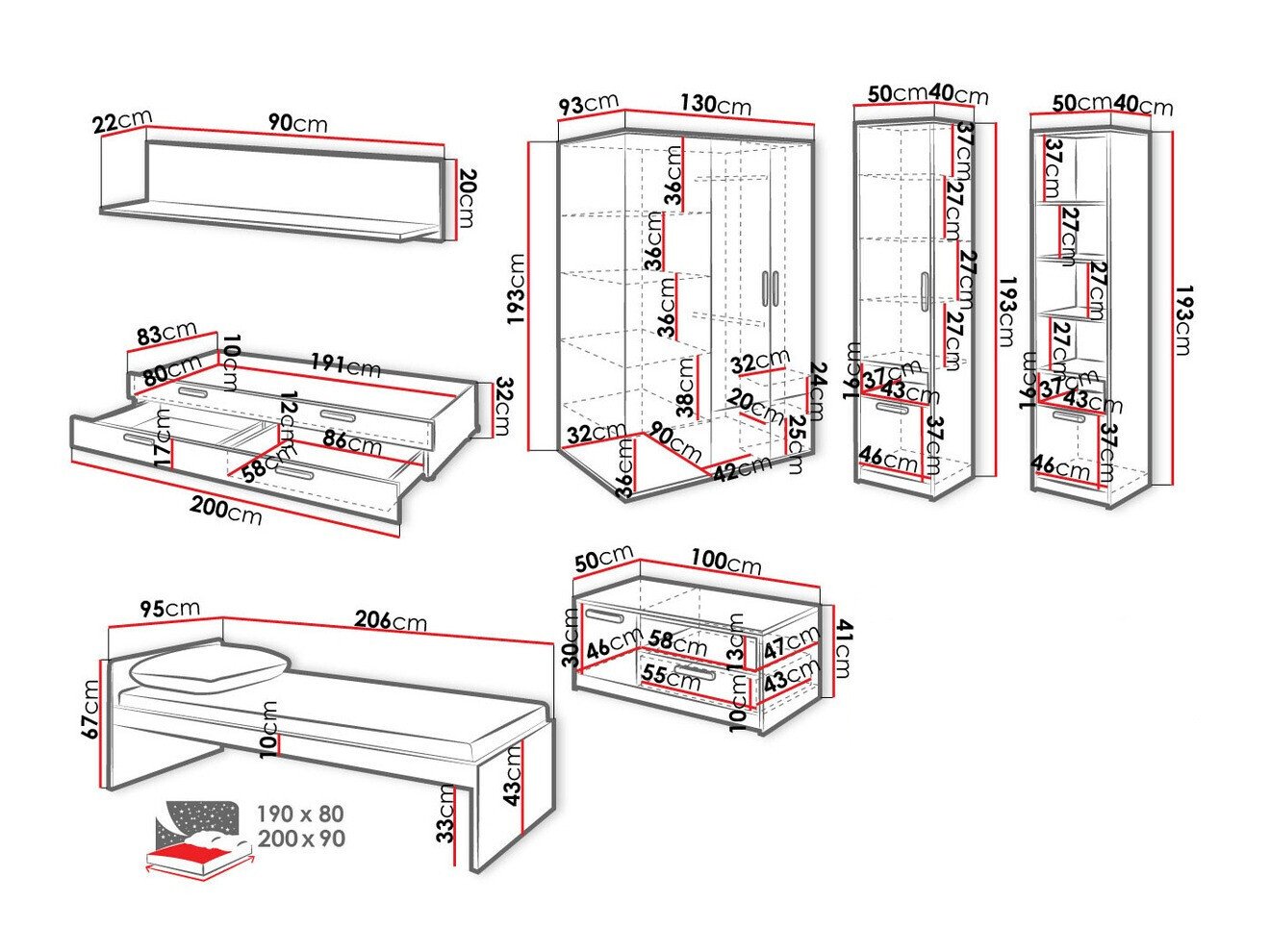 193 cm  90 cm  50 cm