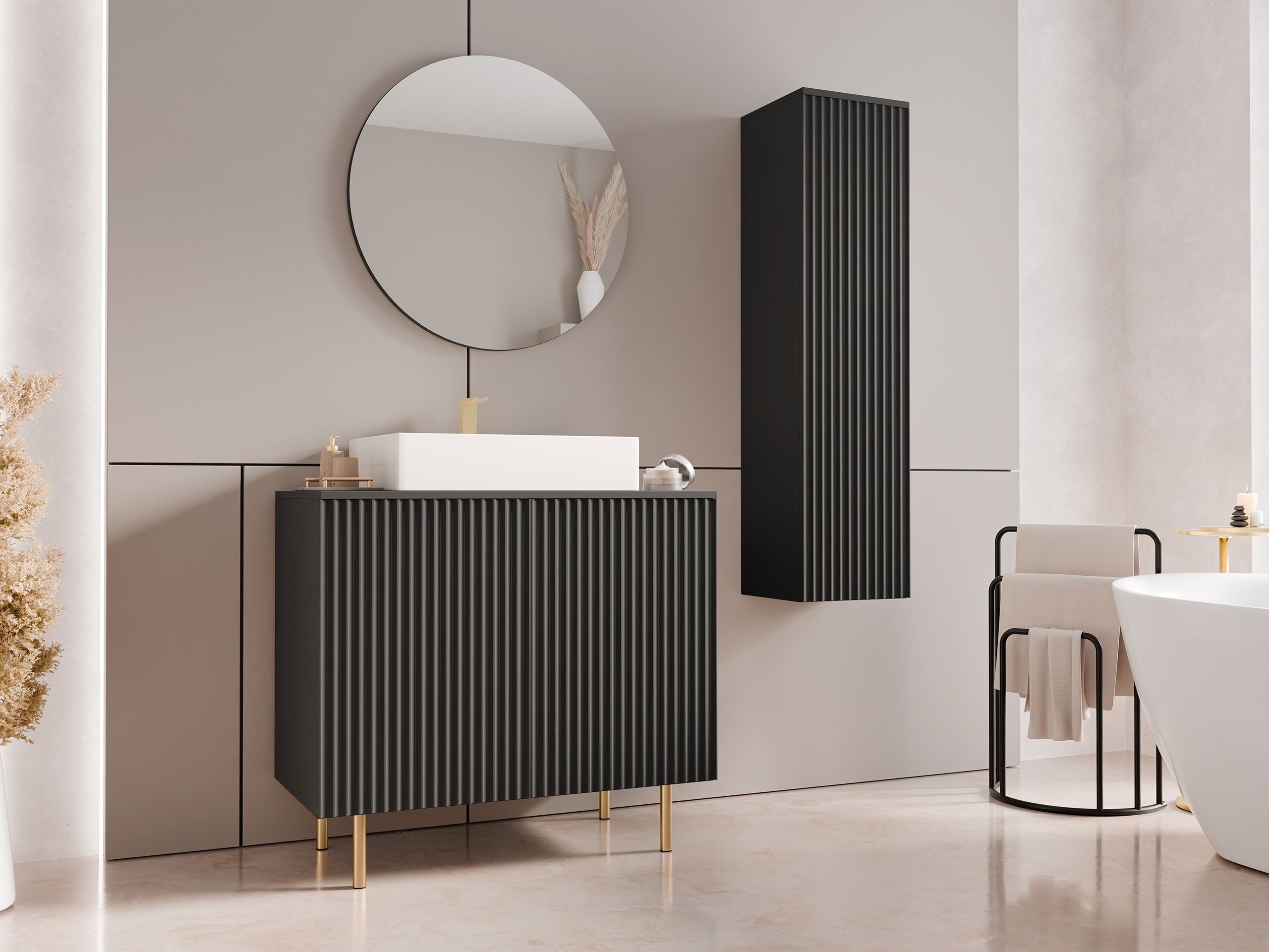 Dans la décoration d'intérieur, ce sont souvent les détails qui créent un sentiment d'unicité. Ces touches finales donnent du caractère à un espace et contribuent à transformer une maison en un foyer. Cette collection de meubles repose sur ce principe. Ici, l'élégance subtile est associée à une fonctionnalité réfléchie, ce qui vous permet de créer un look cohérent et harmonieux dans les différentes zones de la maison. Les finitions rainurées et en lattes ajoutent une touche d'authenticité au design, tandis que les poignées en métal doré et les fonctions discrètes d'ouverture par effleurement sur certaines pièces contribuent à maintenir une esthétique propre et unifiée. Les hauts pieds métalliques sont conçus pour accueillir des aspirateurs robots, et une combinaison de rangements ouverts et fermés permet de faciliter l'organisation de la vie. Cette collection s'intègre sans effort dans les intérieurs classiques modernes, devenant un accent subtil mais saisissant dans la maison.
