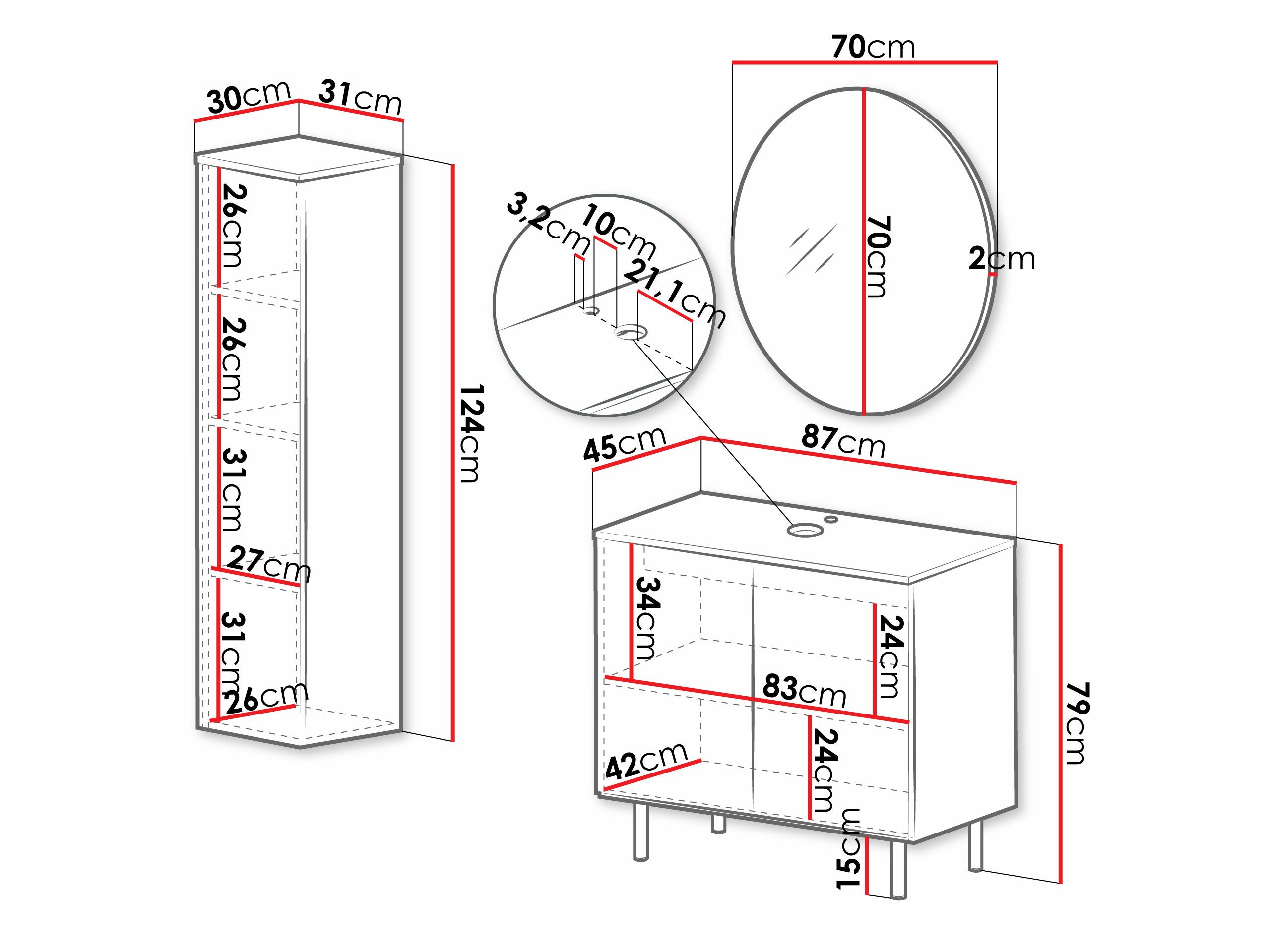 Informations sur la fixation au mur. Les meubles suspendus ou fixés au mur ne sont pas livrés avec des vis de fixation, vous devez donc vous en occuper individuellement. Les différents types de murs nécessitent des vis spécifiques, voire des profondeurs de perçage différentes. Choisissez le matériel de fixation en fonction du poids du meuble et du type de mur (cloison sèche, maçonnerie, bois, etc.). Pour garantir la qualité et la sécurité, utilisez des vis conçues spécifiquement pour votre type de mur.