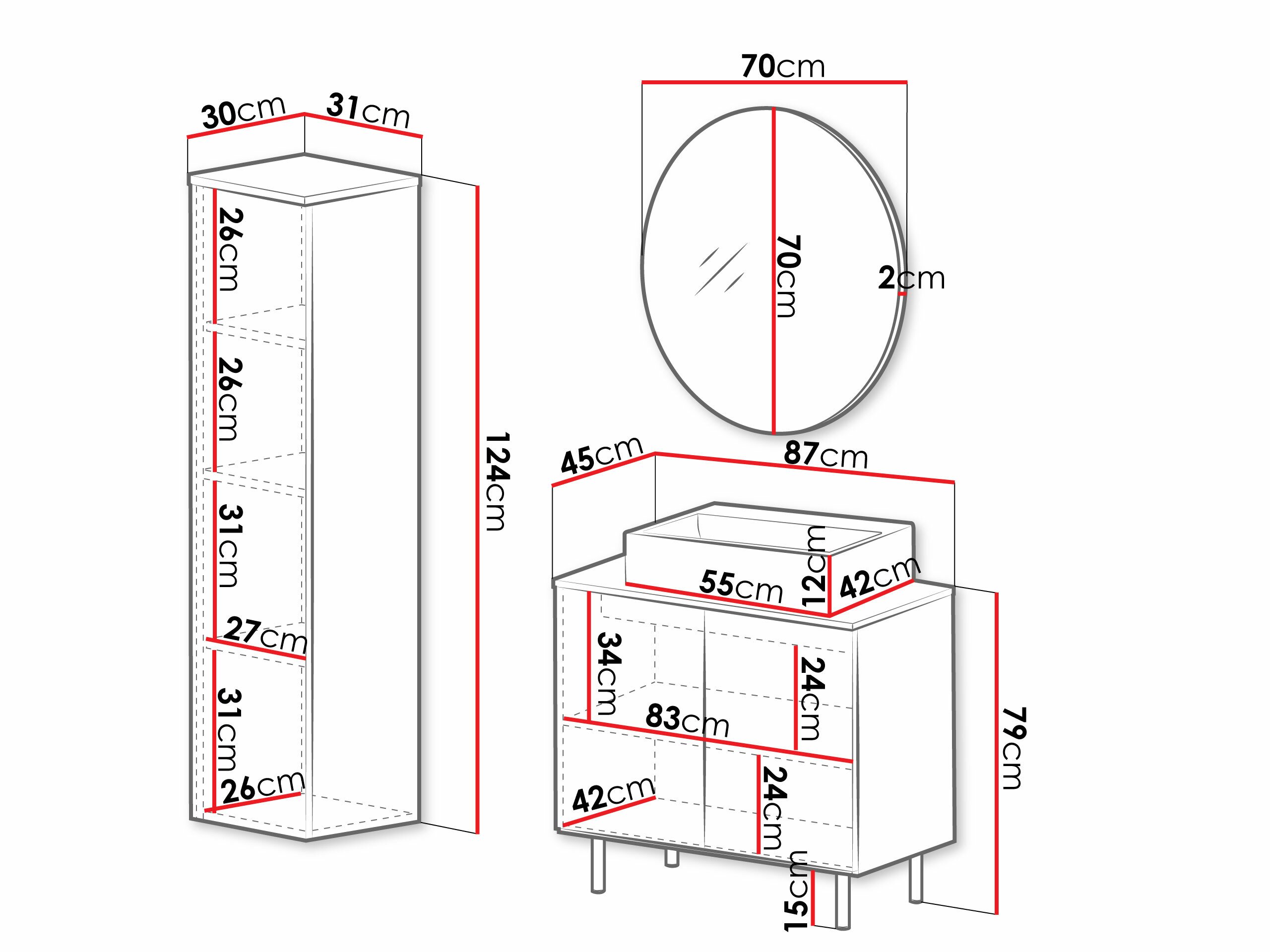 Informations sur la fixation au mur. Les meubles suspendus ou fixés au mur ne sont pas livrés avec des vis de fixation, vous devez donc vous en occuper individuellement. Les différents types de murs nécessitent des vis spécifiques, voire des profondeurs de perçage différentes. Choisissez le matériel de fixation en fonction du poids du meuble et du type de mur (cloison sèche, maçonnerie, bois, etc.). Pour garantir la qualité et la sécurité, utilisez des vis conçues spécifiquement pour votre type de mur.